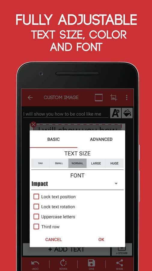 Meme Üretici - Her şeyi doğru anladınız, bu bir meme üreticisidir. Eğlenceli memler oluşturmak için kullanabileceğiniz basit bir uygulama. Burada internetteki en popüler resimler toplandı ve tek ihtiyacınız olan uygun yazıyı eklemek. Burada metni değiştirmek oldukça basit, tek yapmanız gereken parametreleri belirlemek, yazı tipini ve rengi seçmek ve devam etmek. Ayrıca, resmin üzerine yapıştırabileceğiniz çeşitli eklemeler ve çıkartmalar da mevcut.