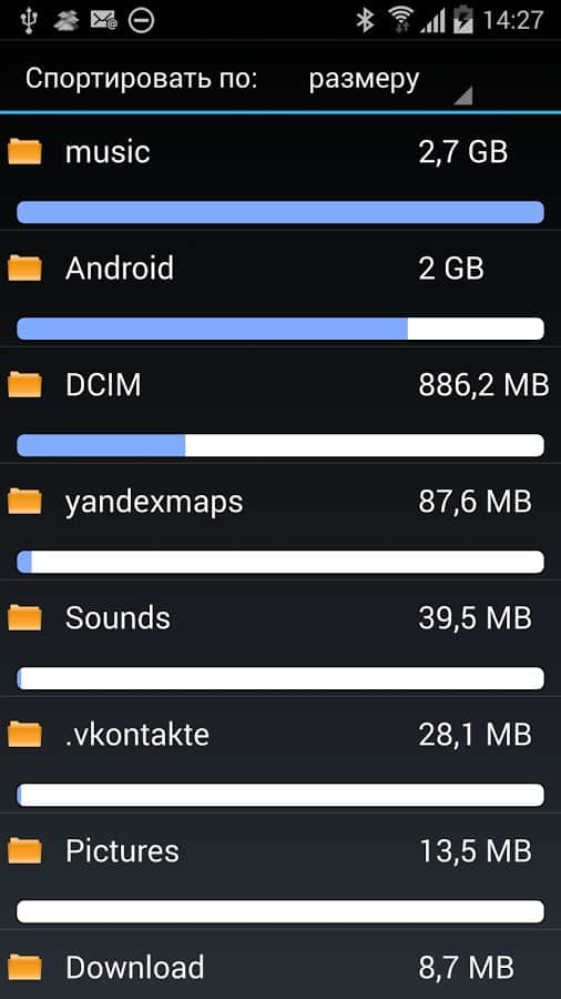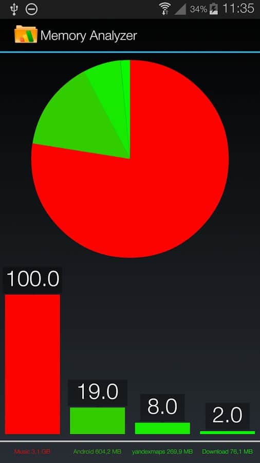 Hafıza Analizörü - Android için yararlı bir uygulamadır - cihazınızın hafızasının neyle dolduğunu belirlemenizi ve temizlemenizi sağlar. Yani, nerede gereksiz çok şey olduğunu kolayca belirleyip tüm gereksiz eşyayı siliyoruz. Özellikler: