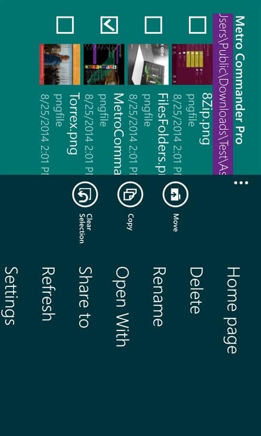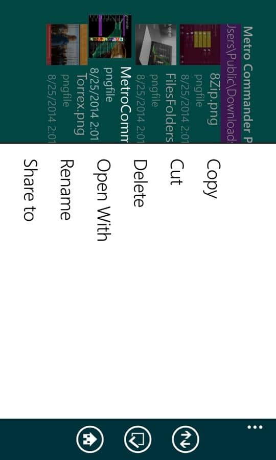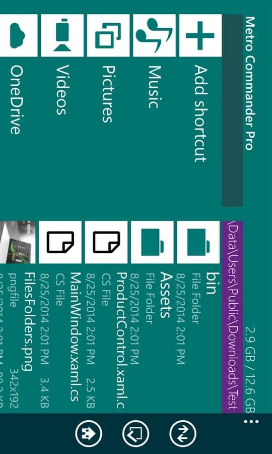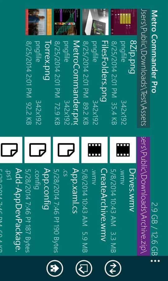 Program, dosyalar ve klasörler ile ilgili tüm işlem seçeneklerini içeren sağlam bir iki panelli dosya yöneticisidir: oluşturma, yeniden adlandırma, taşıma, kopyalama ve diğerleri. Metro Komutanı'nın, sadece cihaz üzerindeki verilerle değil, aynı zamanda SkyDrive bulut depolama hizmetine bağlanma imkanı sunması çok kullanışlıdır; ayrıca Dropbox ile çalışmayı da desteklemektedir.