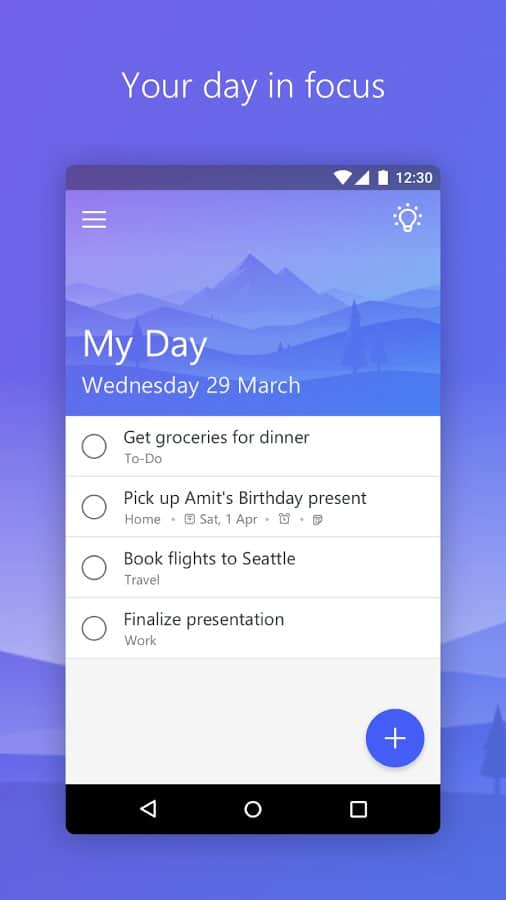 Microsoft To-Do - Gününüzü planlamak, ünlü Microsoft şirketinin yeni uygulaması ile mümkün olan en kolay hale gelecek. Bu planlayıcı, yalnızca işlevselliği ile değil, aynı zamanda kullanıcı dostu arayüzü ile de benzersizdir. Görevlerinizi yolda bile planlayabilir, dağıtabilir ve ekleyebilirsiniz. Kendinize görevler için tamamlama ve hatırlatma süreleri belirleyin, böylece bir şeyi unutma konusunda endişelenmenize gerek kalmaz. Her gün, hafta veya ay yapılması gereken görevler için tekrar eden son tarihler belirleyin, böylece program zamanında size hatırlatabilir.
