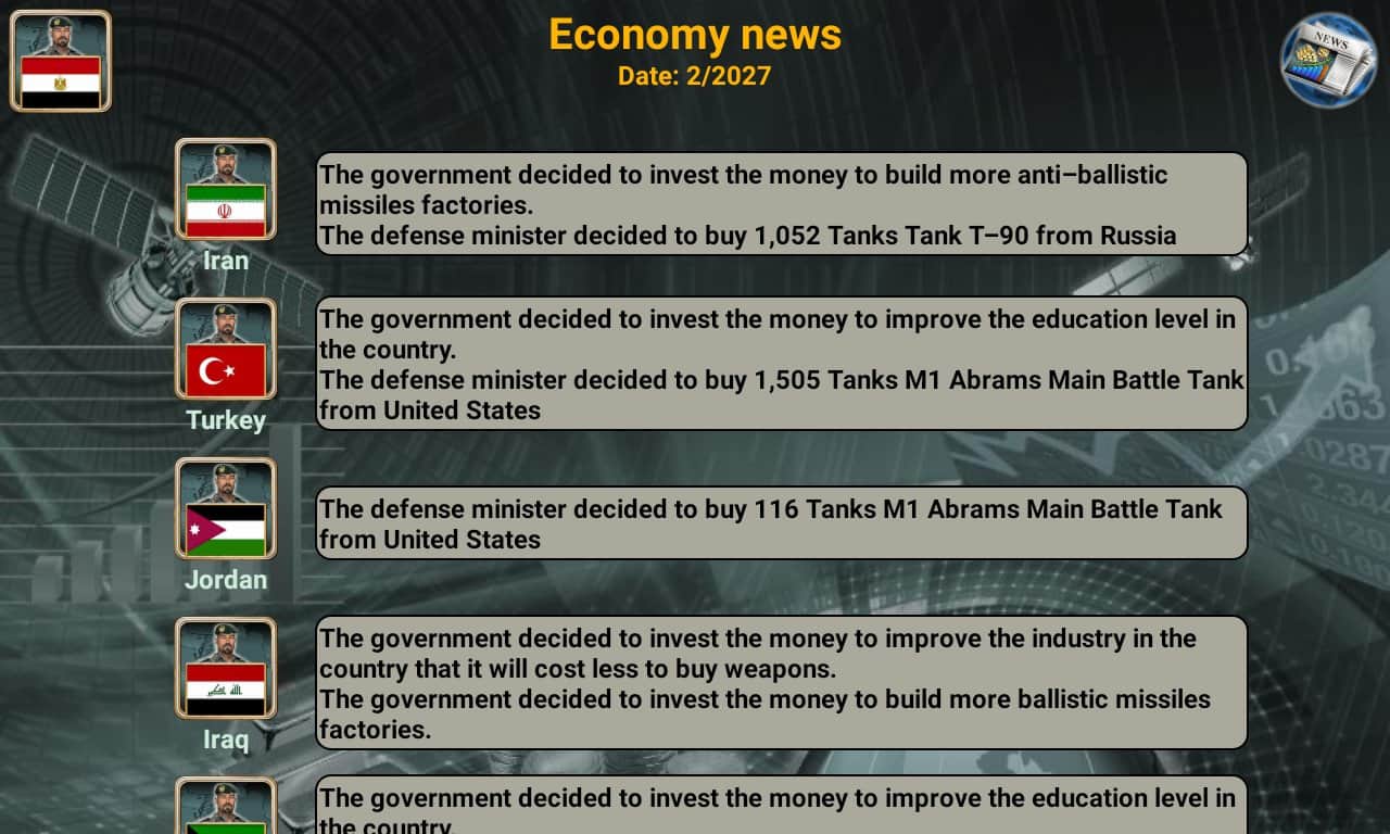 Orta Doğu İmparatorluğu 2027 – sizi 2027 yılına götürecek bir Android strateji oyunudur. Bu oyunda, iktidara gelmiş ve parlamentoya adaylığını koymuş bir isyancı lideri olarak rol alacaksınız. Bu oyundaki ana hedefiniz, Orta Doğu'daki tüm gücü ele geçirmek ve ekonomik olarak gelişmiş bir imparatorluk kurmaktır. Diğer ülkelerle askeri ilişkileri geliştirin, silah satın alın ve casus merkezleri kurun, teknolojileri geliştirin ve dünya haberlerini takip edin. Bu oyunda başarı elde etmek ve liderlik becerilerinizi göstermek için elinizden geleni yapın.