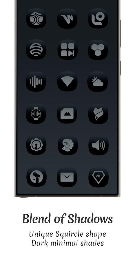 Midnight Dark Icon Pack — kare formların yuvarlaklarla uyumlu bir şekilde birleştiği, modern ve uyumlu bir görünüm yaratan özel bir simge paketi. Koyu gradyanlar simgelere derinlik ve kontrast kazandırarak, Android cihazlar için gece temalı tasarımda mükemmel hale getiriyor.
