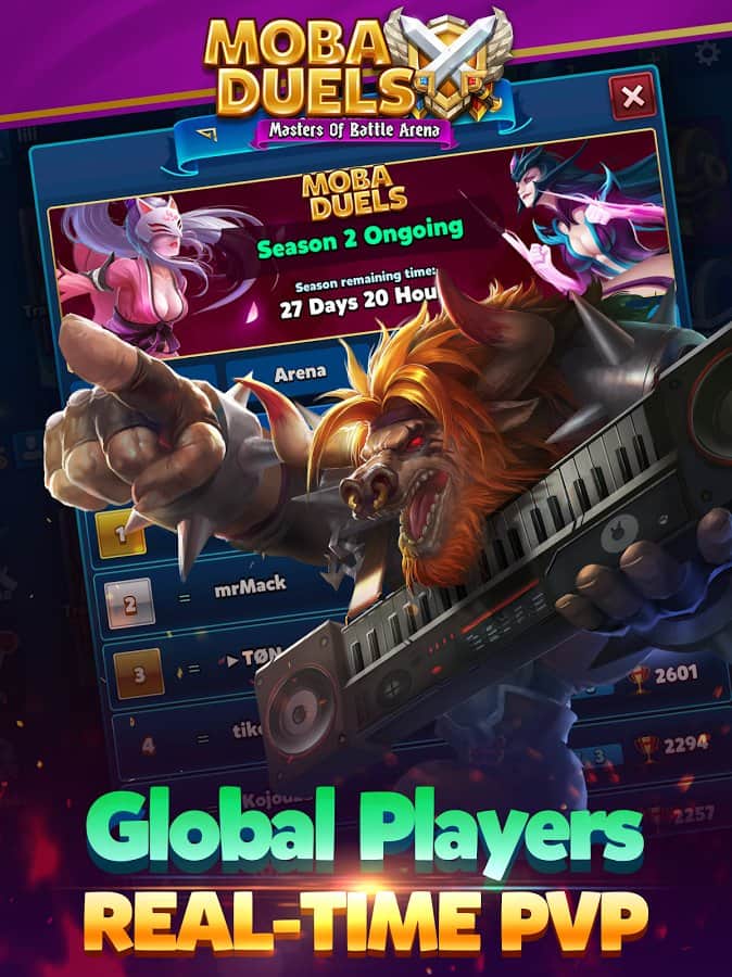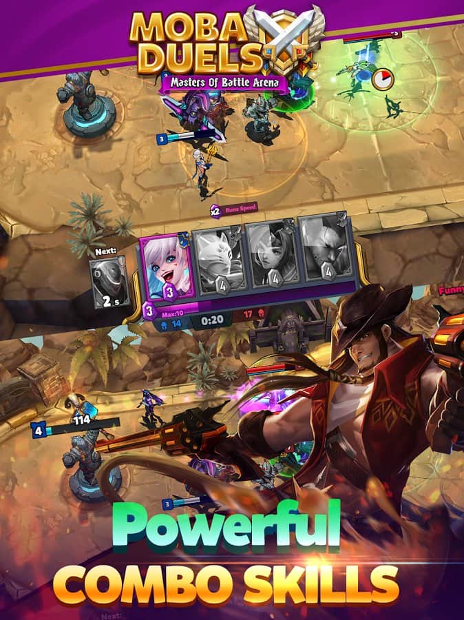 MOBA Düellolar - Savaş Arenasının Ustaları - bu oyunda size oldukça zor bir görev verilecek, düşman üssünü yok etmeniz ve kendi üssünüzü kaybetmemeniz gerekiyor. Bunun için çeşitli haritalarınız olacak, bu haritalar kahramanları veya savaşçıları çağırır, her bir birlik türünün kendi saldırı, savunma ve diğer birçok gösterge değeri vardır, kahramanlar için de aynısı geçerlidir. Gerçek oyuncularla savaşacaksınız, bu nedenle karakter destesi oluşturmak ve oyunun tüm stratejisini planlamak çok önemlidir.