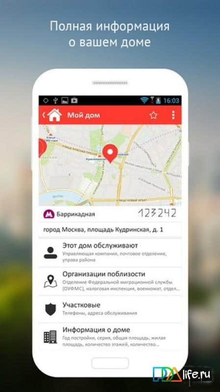 Benim evim – size hizmet veren kurumlar hakkında gerekli bilgileri bulmanızı sağlayan ilginç bir araçtır. İdari hizmetler, hastaneler, muhtarlar, postaneler ve evinizi etkileyen diğer yönetim şirketleri. Hizmet, Rusya genelinde mevcuttur. Ancak en kapsamlı ve geniş veri tabanı Moskova ve Moskova bölgesinde toplanmıştır. Uygulamadaki bilgiler sürekli güncellenmektedir, bu nedenle zamanla geliştiriciler ülkenin dört bir yanını kapsamayı planlamaktadır. Ayrıca evinizle ilişkili yapıların yanı sıra, evin kendisi hakkında da bilgi alabilirsiniz: yapım yılı, inşaat serisi, kat sayısı ve diğer bilgiler.