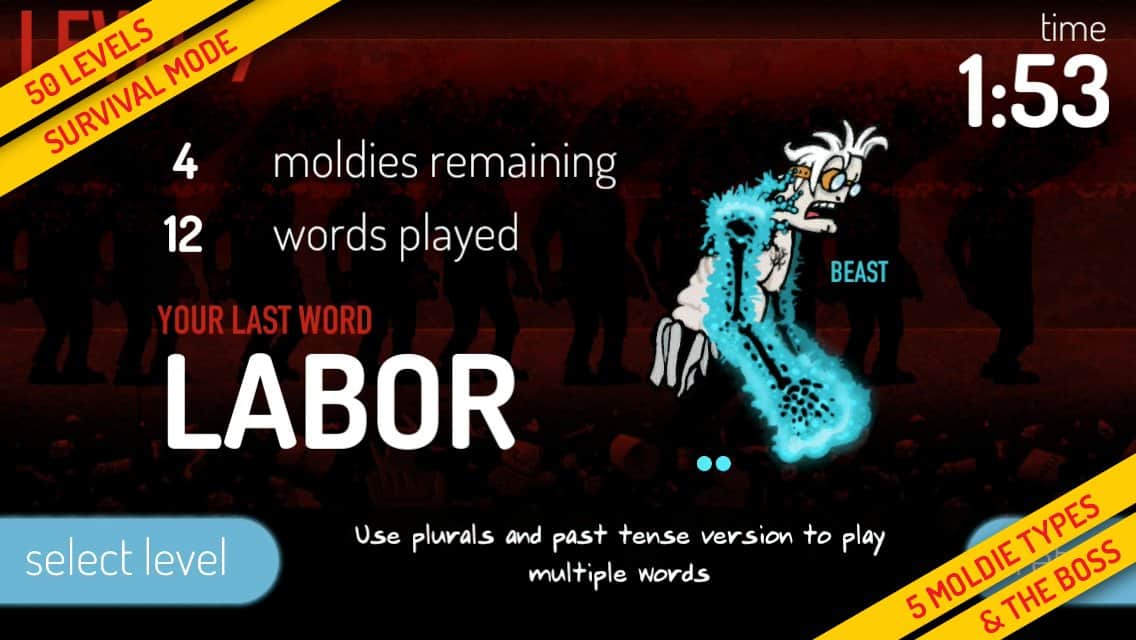 Moldicide – Android için eğlenceli bir bulmaca oyunu, burada kelimeleri bir araya getirip zombileri yok etmeniz gerekiyor. Bu oyundaki ana göreviniz anagramlar oluşturmak ve bu şekilde zombileri yok etmek için ölümcül silahı harekete geçirmektir. Özel bir kostüm içinde, zırhlı bir kapının arkasında kelimeleri çözerken ve silahı etkinleştirirken zombiler size doğru saldıracak. Sizi bekleyen iki oyun modu var: ilk mod, epik maceralar ve zombilerle mücadele içeren bir hikaye modu; ikinci mod ise hayatta kalma modu, burada daha zor görevler ve misyonlar olacak. Tüm bulmacaları çözün ve dünyayı zombilerden kurtarın.