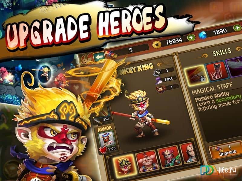 Maymun Kral Destanı – 'tower defense' türünde ilginç bir oyundur. Ruh efendinizi çeşitli düşmanların saldırılarından koruyun. Türün gerektirdiği gibi, aşılmaz bir savunma inşa edeceğiz; oyunda kulelerin rolünü cesur savaşçılar üstlenecek ve her biri farklı özelliklere sahip olacak. Doğru savaşçının konumunu akıllıca belirleyerek her zaman optimal bir savunma elde edebilirsiniz.