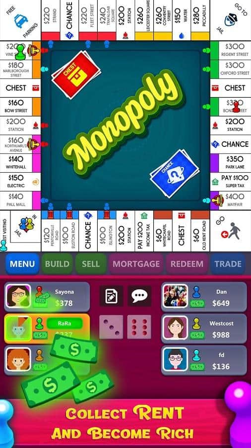 Monopoly – Android için heyecan verici bir masa oyunu, burada monopoly oynayacaksınız. Bu oyuna aynı anda altı oyuncuya kadar zar atarak ve zarları kareler üzerinde hareket ettirerek katılabilirsiniz. Şansınızı gerçek anlamda test edin ve en iyi monopolist olduğunuzu kanıtlayın. Oyun alanındaki boş karelerde durun ve orada gayrimenkul satın alın. Mümkün olduğunca fazla gayrimenkul satın alın ve mümkün olduğunca fazla kar elde edin. Rakipleriniz sizin gayrimenkulünüzün üzerinde durduklarında size para ödeyecekler. Rakiplerinizi iflas ettirin ve en zengin oyuncu olun.