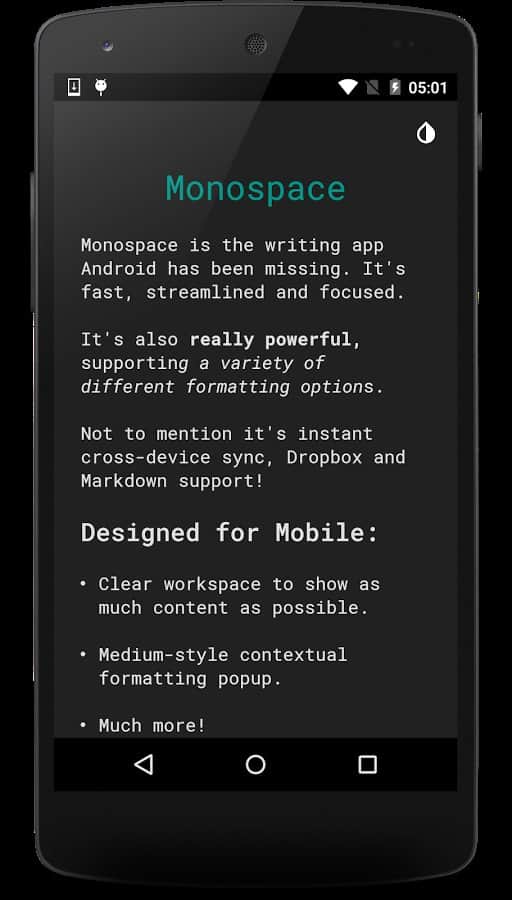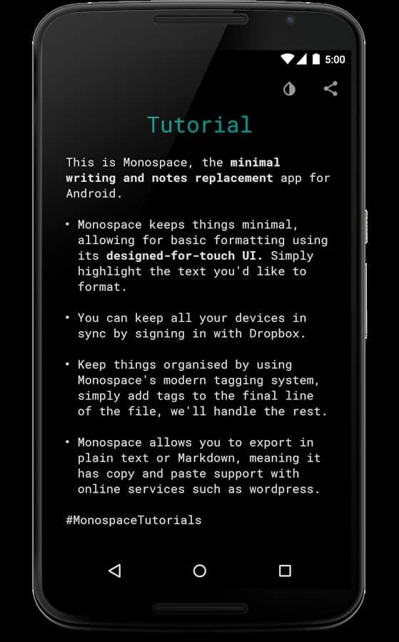 Akıllı telefon veya tablette not yazmak veya hatta kısa taslaklar oluşturmak kolay ve keyifli, ancak bazen ilgili uygulamalar o kadar fazla ek unsurlarla doludur ki, onlarla çalışmak zorlaşır. Monospace Writer farklı bir türde bir editördür: burada gereksiz hiçbir şey yok, sadece en temel olanlar.