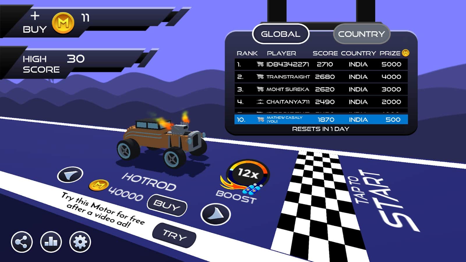 Motor Parkour – arabayı kontrol altına alın ve onu zorlu bir parkurdan geçirin. Yolunuzda sürekli olarak dikenler, ateş, rampalar ve engeller gibi çeşitli engellerle karşılaşacaksınız. Bu oyundaki ana göreviniz mümkün olduğunca uzun mesafe kat etmek ve kendi rekorunuzu kırmaktır. Yol boyunca birçok madeni para toplamayı ve her türlü numarayı yapmayı unutmayın. Arabanız, ihtiyaç duyduğunuz anda hızlanabilir veya yavaşlayabilir, ayrıca dar bir delikten geçmek için alçalmayı da başarabilir. Kendinizi eşsiz dış görünümüyle mutlu edecek yeni arabaları keşfedin.