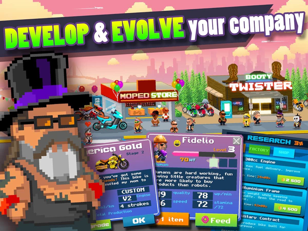 Motor Dünyası: Motosiklet Fabrikası – motosiklet üretim fabrikasını kontrol edeceğiniz Android için heyecan verici bir oyun. Fabrikanızda skuter, klasik motosiklet, spor motosiklet ve chopper toplayabilirsiniz. Mevcut parçaları kullanarak çeşitli motosiklet modelleri toplayın ve mümkün olduğunca çok işçi işe alın, ayrıca ekipmanınızı geliştirin. Başarıyla tamamladığınız görevler için yeni motosiklet parçaları şeklinde ödüller alacaksınız. Fabrikanızı geliştirin ve şehir yollarında arkadaşlarınızla yarışabileceğiniz modern motosiklet modelleri toplayın. Arkadaşlarınıza benzersiz motosikletler yaratmalarında yardımcı olun ve onlardan hediyeler alın.