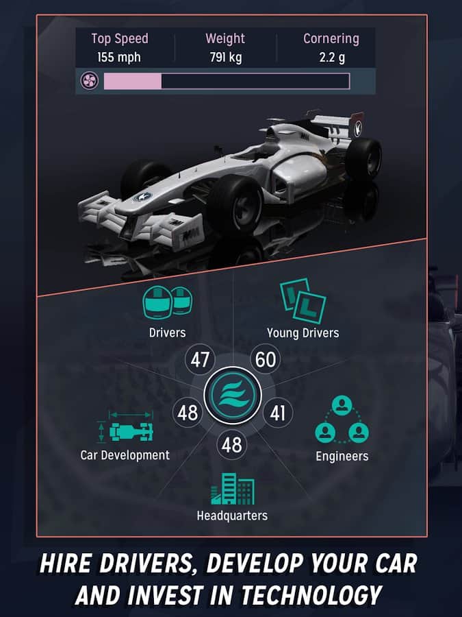 Motorsport Manager, Android için tam anlamıyla bir Formula 1 takım yönetim simülatörüdür. Takım için önemli tüm kararları alma sorumluluğu sizde olacak. Yarışçılar işe almak, arabaları satın almak, mühendisleri işe almak, sponsorlarla sözleşmeler yapmak. Yönetici olarak çalışmanın yanı sıra, yarışlara da katılacaksınız. Yarışları özel şemalar aracılığıyla takip edeceksiniz ve çeşitli durumlar ortaya çıktıkça gerekli kararları alacaksınız.