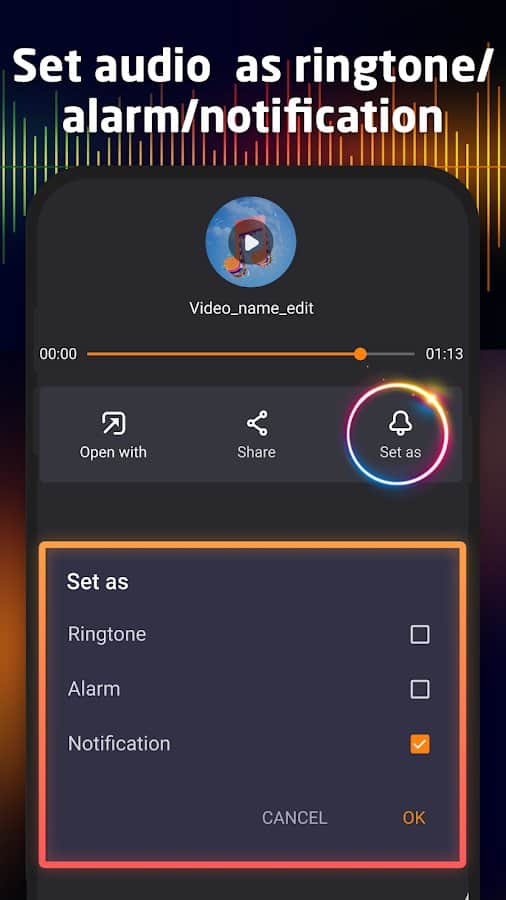 MP3 Dönüştürücü - Videodan MP3'e - Herhangi bir yüklenen video dosyasını mp3, m4a, aac, ogg, flac, wav, wma veya ac3 formatında ses parçasına dönüştürün! Standart mp4 dışa aktarma işlevinin yanı sıra, ses seviyesini artırmak, seçilen parçaları kesmek ve sesin azalmasını sağlamak gibi bazı temel düzenlemeleri de yapabilirsiniz. Dosya üzerinde daha rahat çalışabilmeniz için, yakınlaştırabileceğiniz veya uzaklaştırabileceğiniz tam bir ses dalgası diyagramınız olacak. Daha sonra, nihai dosyayı indirebilir, zil sesi olarak ayarlayabilir ve diğer insanlarla paylaşabilirsiniz.