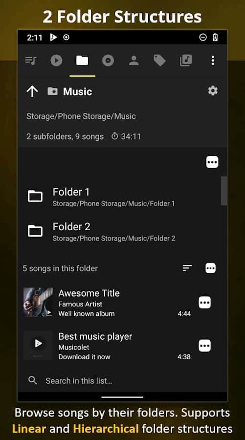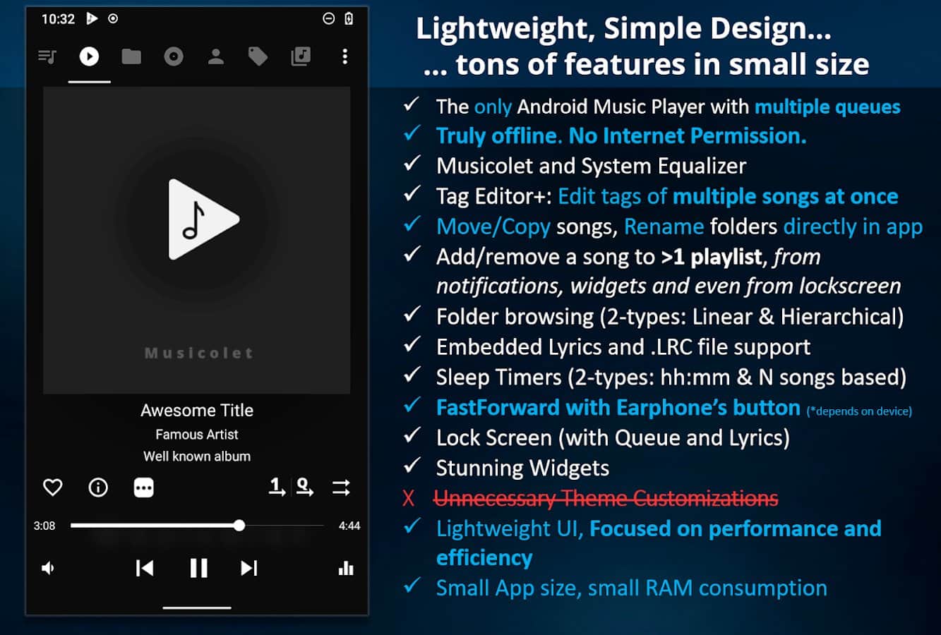 Musicolet Müzik Çalar - Müzikle uyum durumuna dalın! Bu uygulamayı, sevdiğiniz şarkıların çalınması için sıraya koyma imkanı bulduğunuz, yalnızca gerekli işlevleri bir dokunuşla kullanabileceğiniz, müzik eserlerini hızlıca ileri sarabileceğiniz, her şeyi klasörler halinde gruplandırabileceğiniz, ekolayzır kullanabileceğiniz ve şarkı etiketlerini düzenleyebileceğiniz kullanışlı bir yer olarak kullanın. Kesinlikle burada uzun süre kalacaksınız, bu yüzden bir uyku zamanlayıcısı ayarlayın! Görsel çözümleri değiştirin, açık veya koyu tema seçin, müziğin ritmini hissedin!