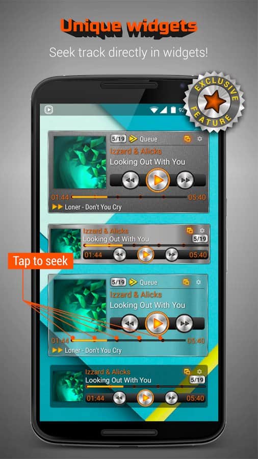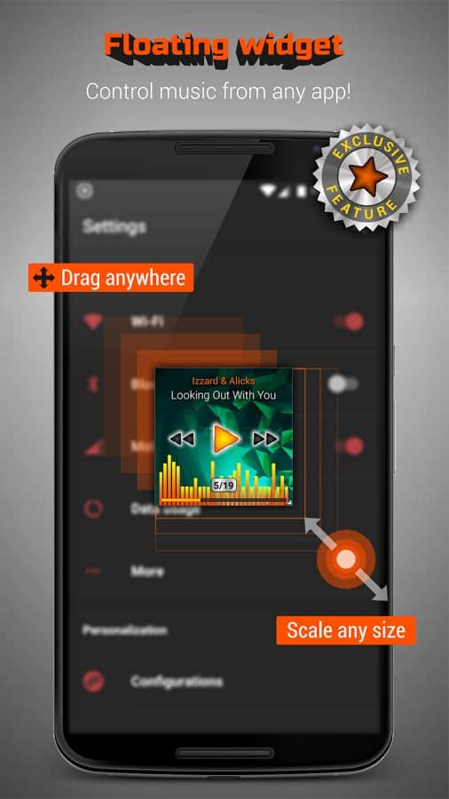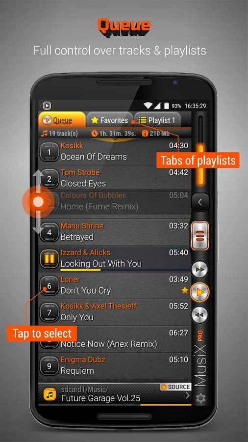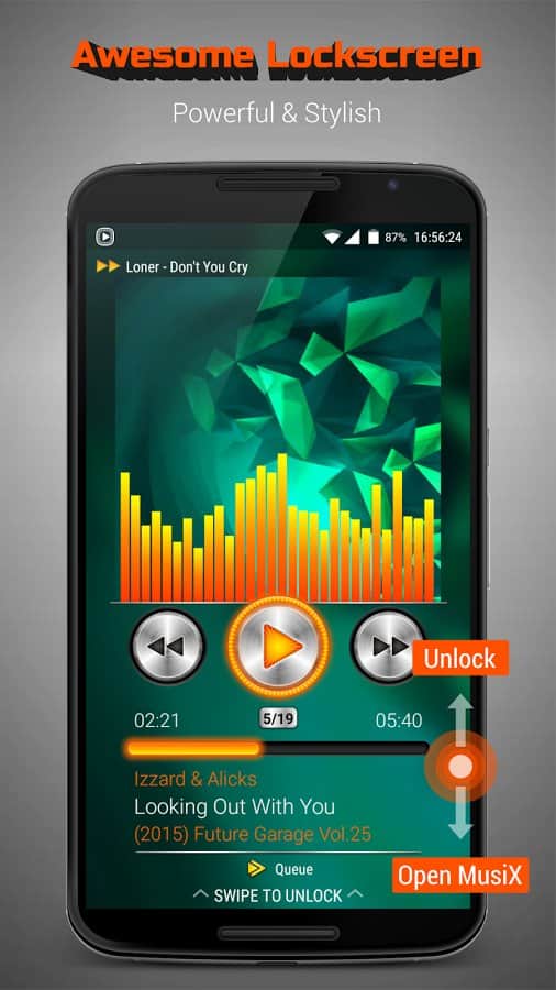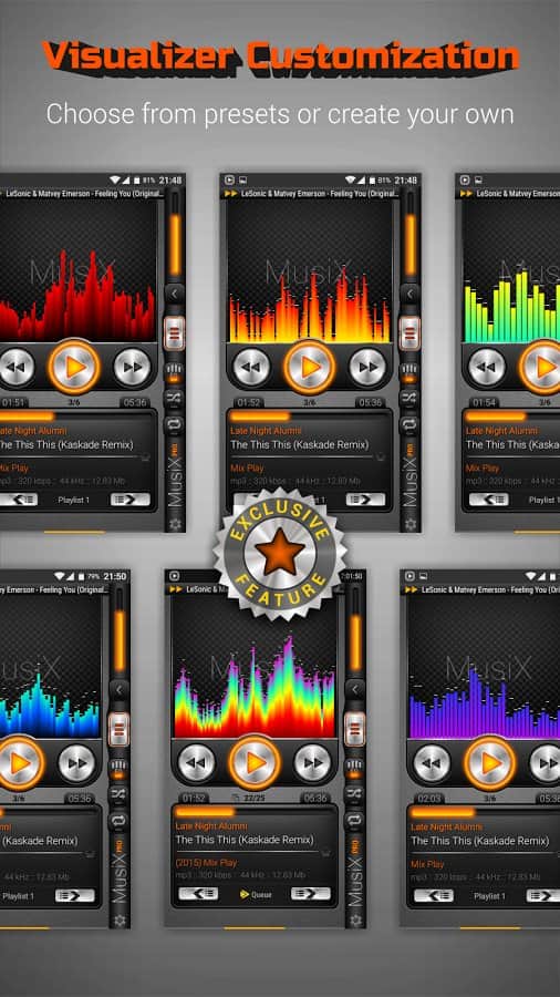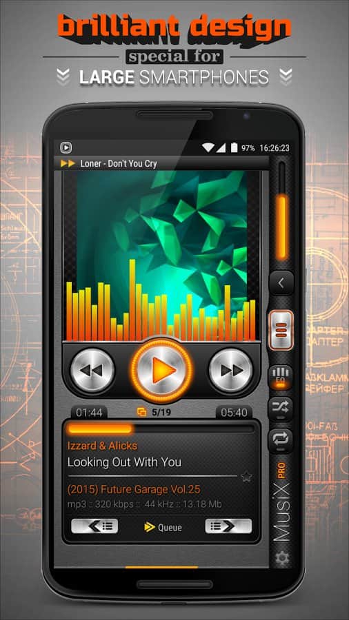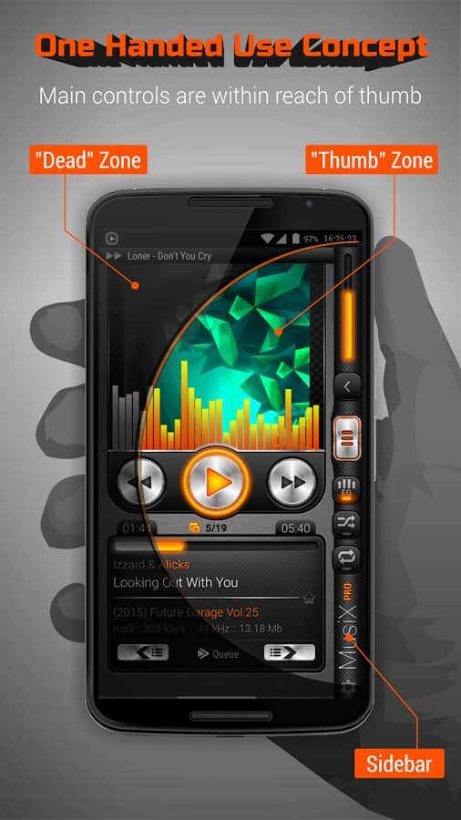 MusiX Player, büyük ekranlı akıllı telefonlar (4,5-6 inç) için mükemmel bir şekilde uygun, canlı ve etkileyici bir tasarıma sahip fonksiyonel bir oynatıcıdır. Büyük cihazlar için özel olarak tasarlanmış bu tasarım, oynatıcıyı kullanırken unutulmaz bir deneyim sunar. Çok sayıda ses formatını desteklemesi ve ince ayar yapılabilen ekolayzır, her oynatıcı için gerekli olan doğal minimum işlev setidir.