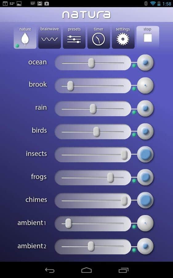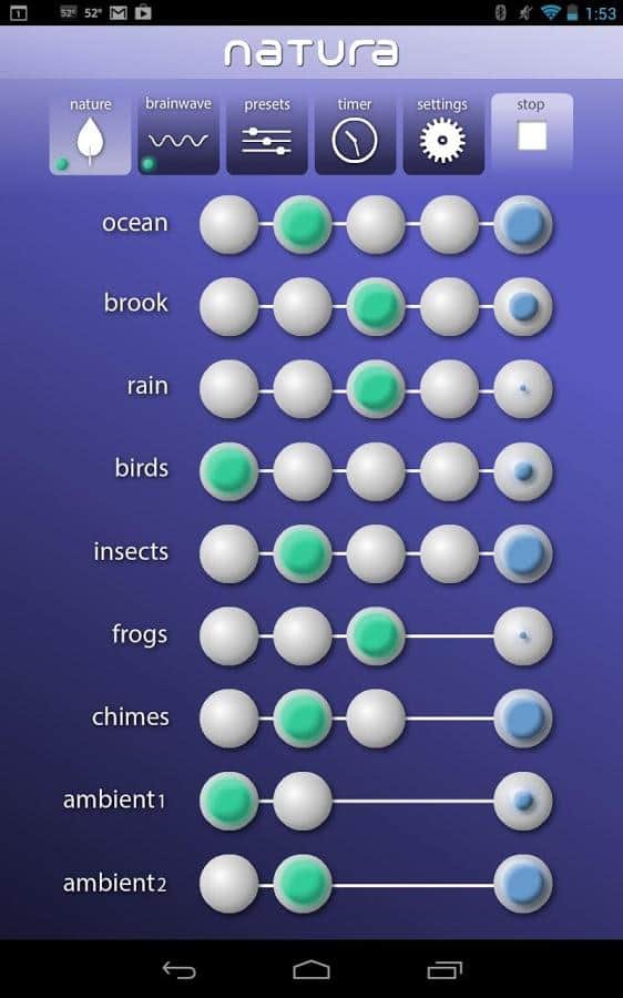 Natura Ses Terapisi - hoş bir ses ortamı oluşturmanıza olanak tanıyan bir Android uygulamasıdır. Uygulama, ses terapisi çerçevesinde (kısmen yoga ve spa salonlarında) aktif olarak kullanılmaktadır. Bu program sayesinde, sizi rahatsız eden düşüncelerden uzaklaşabilir ve rahatlayabilirsiniz. Doğa sesleri, yağmur sesi, rüzgar, kuş cıvıltısı ve diğer hoş sesler denge ve uyumunuzu yeniden sağlamanıza yardımcı olacaktır. Ayrıca, kendi bestelerinizi oluşturabilirsiniz. Arayüz kullanışlı ve basittir. Uygulama şunları içermektedir: