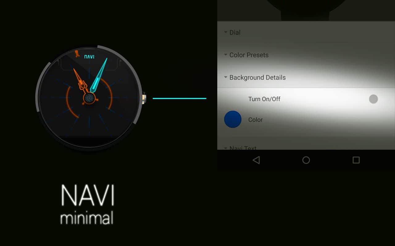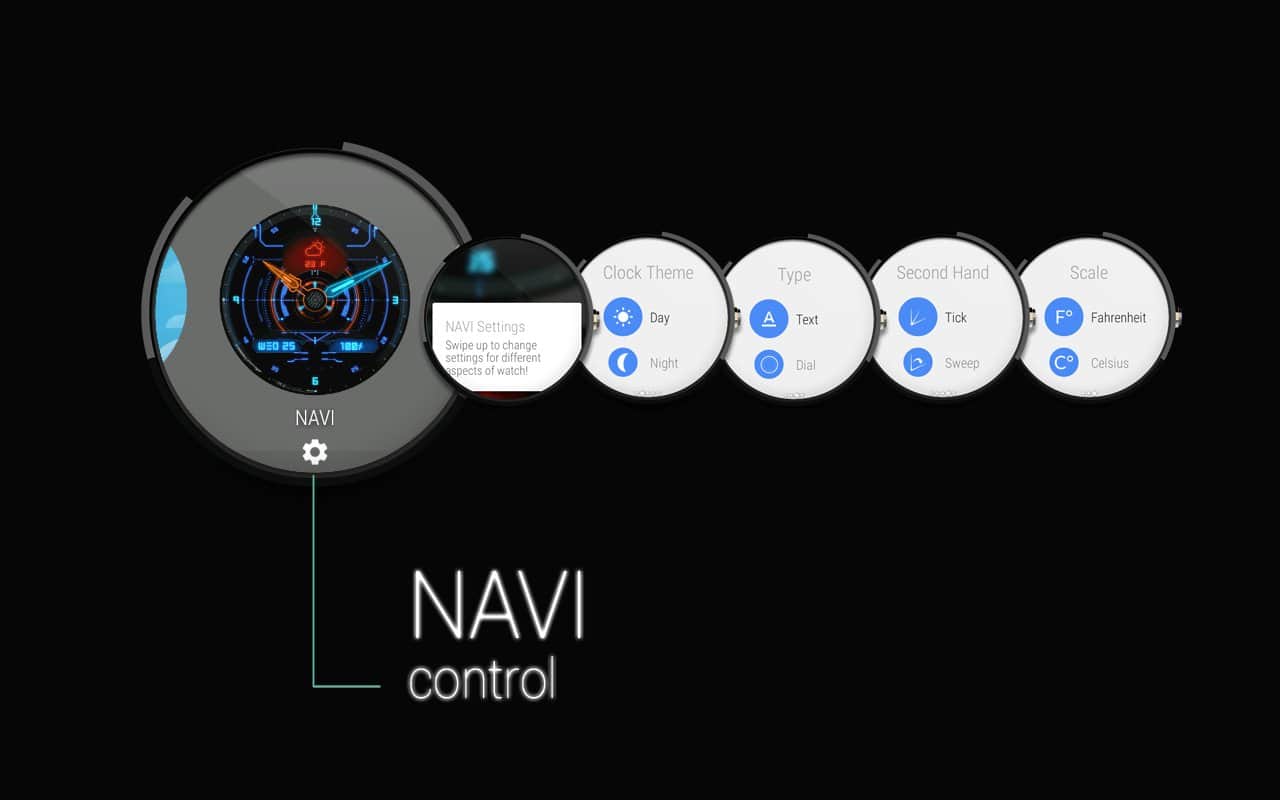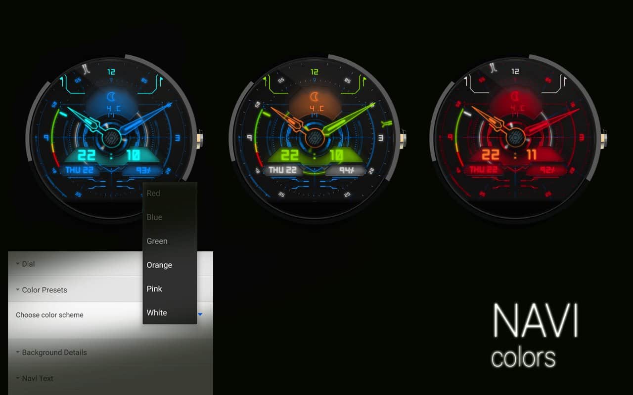 Harika, ince detaylarla ve parlak renklerle dolu bir saat yüzü her türlü saati süsleyebilir. NAVI, bir kaç ibre ve küçük bir saniye göstergesi ile analog bir saat yüzüdür. Kullanıcıya sunulan birkaç renk kombinasyonundan birini seçme imkanı verir ve ekranda hava durumu, pil seviyesi, tarih ve elbette mevcut zaman bilgisi yer alır. Ayrıca, uygulamada birçok esnek ayar bulunmaktadır.