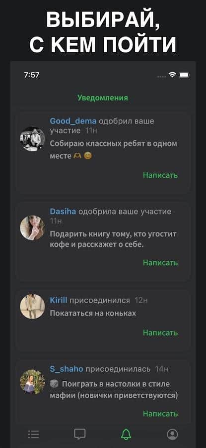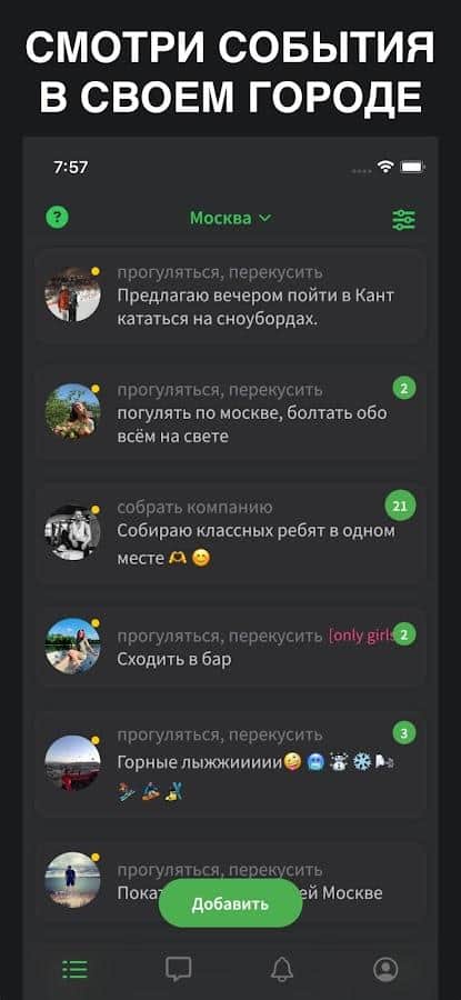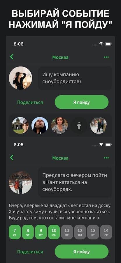 Yeni arkadaşlar veya tanıdıklar bulmak için şehrinizdeki tüm yaklaşan etkinliklerin listesini gözden geçirin, bu etkinliklere katılırsanız! Her etkinlikte kesin tarihleri, bazı katılımcıları ve "Ben gidiyorum" veya "Paylaş" butonlarını göreceksiniz. İlanın sahibi yalnızca isteğinizi kabul edebilir ve katılımınızı onaylayabilir, bu yüzden bu olduğunda bildirim alacaksınız. Uygun olmayan tarihlerden kaçınmak için, size uymayan tarihleri filtreleyin. Gerekirse, hoşlanmadığınız etkinlikleri veya kullanıcıları engelleyebilirsiniz.