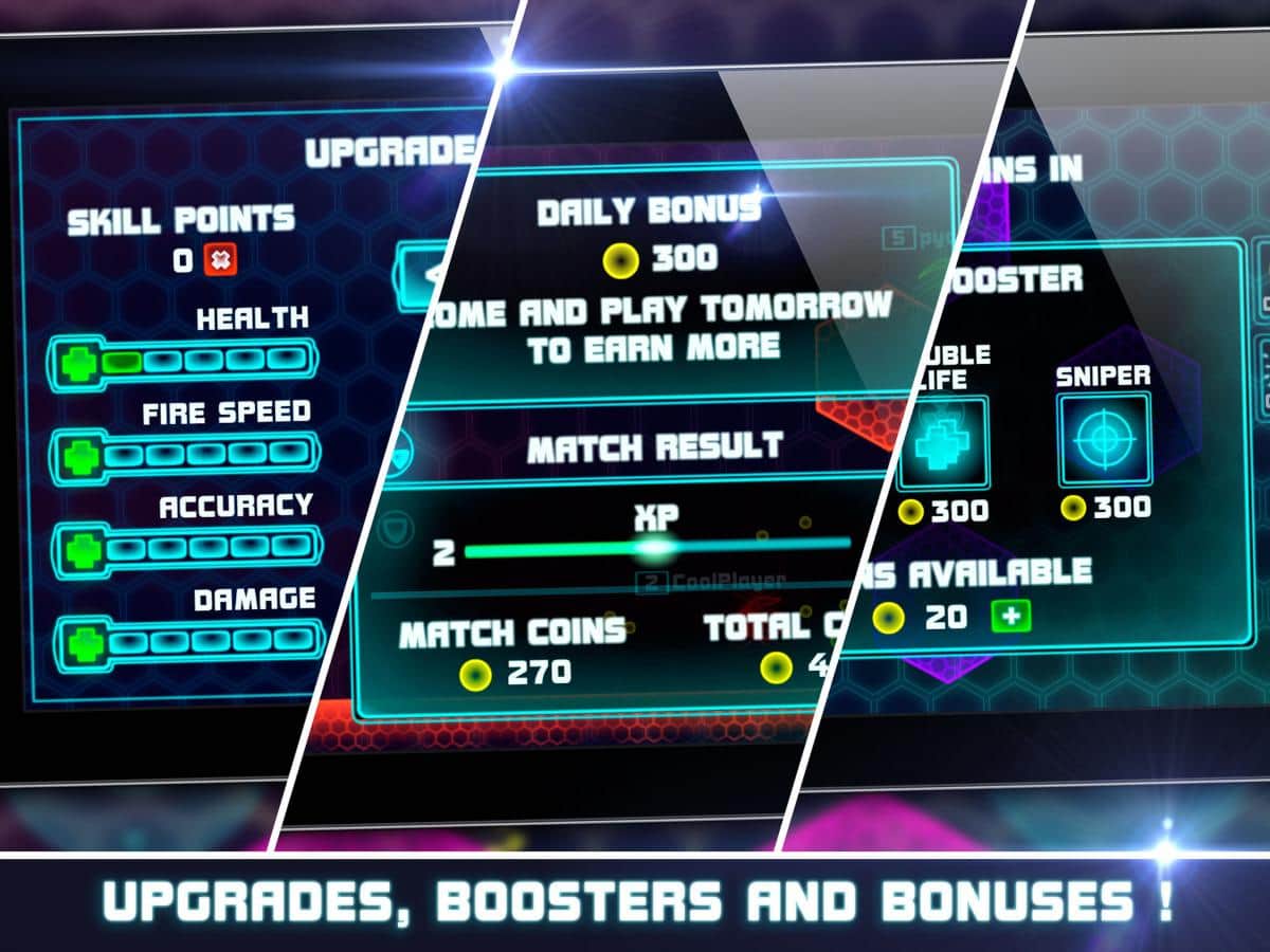 Neon Savaş Alanı - sizi futuristik grafiklerde dinamik savaşlar bekliyor. Uzay nişancı, çok oyunculu mod ile dünyanın herhangi bir yerinden oyuncularla savaşma imkanı sunuyor. Kendi geminizi seçin, savaşlarda puan kazanın ve daha etkili dövüşler için uzay geminizi geliştirin. Tek kullanımlık çift hasar bonusunu kullanın - düşman için daha fazla hasar, ancak diğer oyuncular da sizin peşinize daha çok düşecek, çünkü siz onlar için bir lokma! Oyunun bir başka hoş özelliği - internetiniz kesilirse, otomatik olarak botlarla oynamaya devam edersiniz ve internet bağlantınız geri geldiğinde, tekrar gerçek oyuncularla oynarsınız.