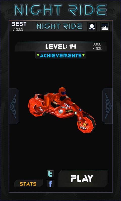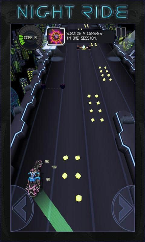 Android için "Tron" filminden alınan motosikletlerle fantastik yarışlar. En güzel parkurlarda yarışın, engellerden kaçının, hızınızı artıran veya darbelerden koruyan ya da ateş etme imkanı veren çeşitli bonusları toplayın ve kullanın. Ancak bonuslar sonsuz değil, artan hız ise sizi rahatsız etmeyecek! Bu yüzden yoldan çok fazla dikkatinizi dağıtmayın, çünkü bu kadar çılgın bir hızda dikkatli olmak, motosikletin üzerinde daha uzun süre kalmanın anahtarıdır! Gerçek rakiplerle OpenFeint üzerinden oynayabilirsiniz. Android için Gece Sürüşü oyununda bu çılgın yarışlarda zafer kazanmaya çalışın.