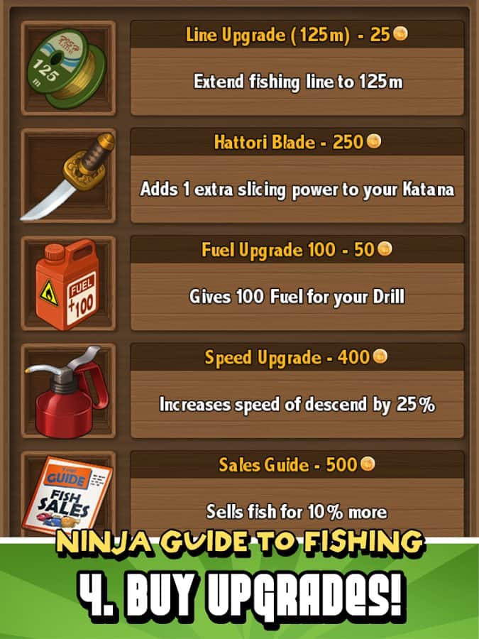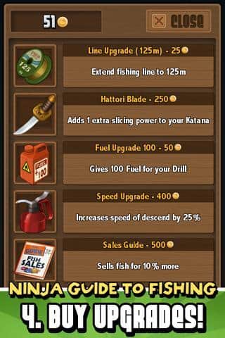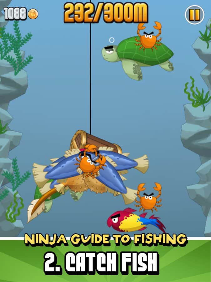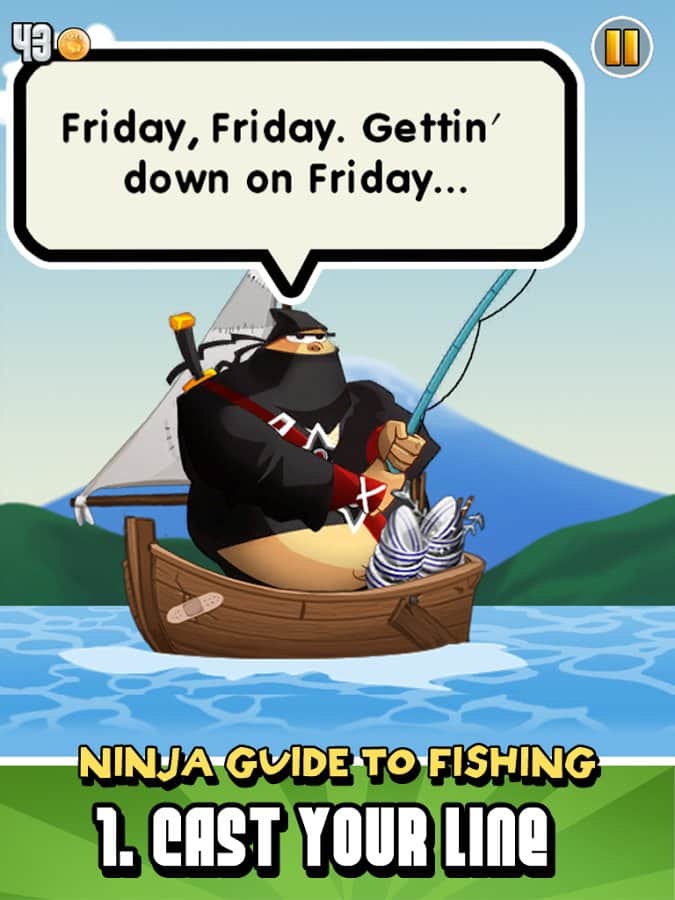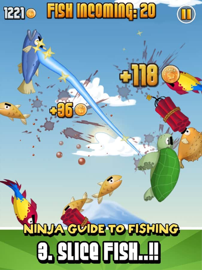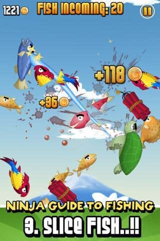 Ninja Balıkçılığı - Android için ilginç bir arcade oyunu, sıradan balık tutma ile meyve kesme oyununu birleştiriyor. Burada biz balıkları kesiyoruz. Oyun başladığında, bir ninja botun içinde oturuyor, oltayı atıyor ve balık yakalıyor. Daha sonra balığı havaya fırlatıyor, sizin göreviniz balık havadayken onu kesmek.