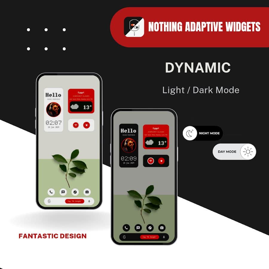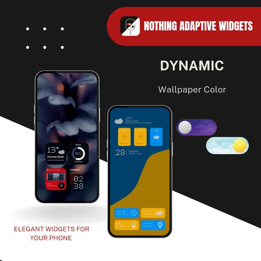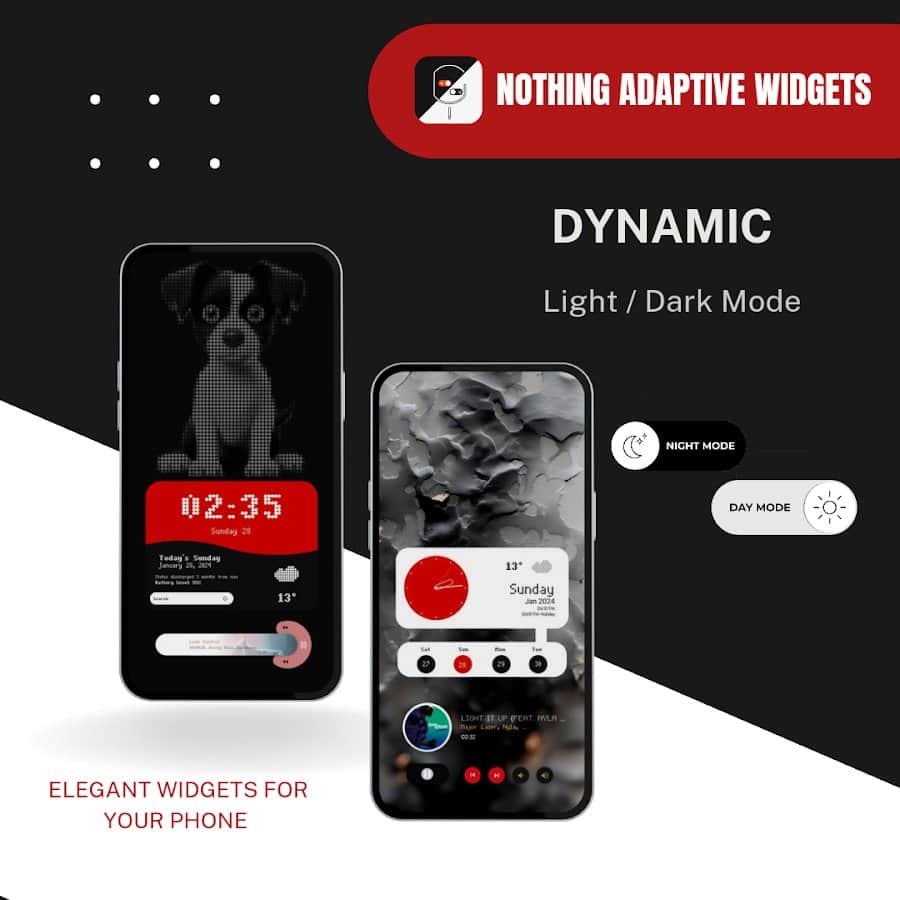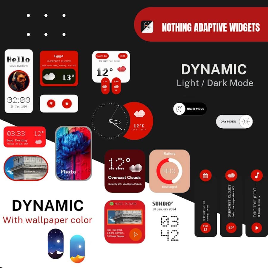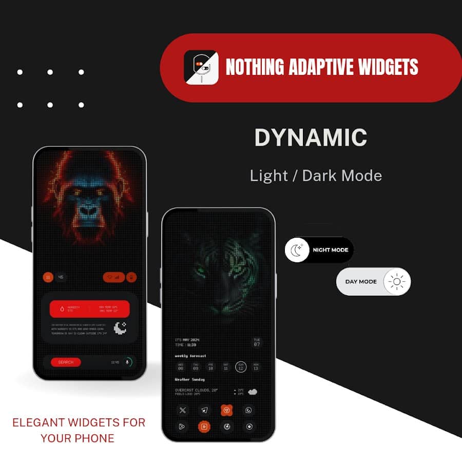 Nothing Adaptif widgetler - zarif bir arayüze sahip adaptif widgetler, kullanıcı müdahalesi olmadan tek bir bakışta önemli bilgileri sağlayarak parlak gündüz modu ile loş gece modu arasında otomatik olarak geçiş yapar. Nothing Adaptif widgetleri, yüklediğiniz her duvar kağıdına benzersiz bir estetik görünüm kazandırarak duvar kağıdı renkleriyle dinamik olarak etkileşimde bulunan widgetler içerir, bu da ekranınızı daha çekici ve işlevsel hale getirir.