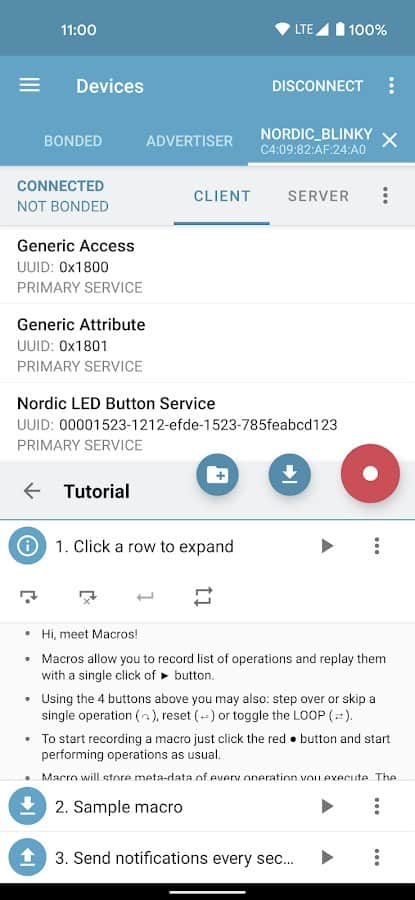 RF Connect for Mobile - düşük enerji tüketimli BLE (Bluetooth low energy) cihazlarını tarayıp keşfedebilen bir uygulama. Ayrıca bu uygulamanın hayatı kolaylaştıracak birçok başka kullanışlı özellikleri de var: hizmetlerin ve özelliklerin keşfi ve analizi, özelliklerin analizi, makrolar kullanarak işlemlerin kaydedilmesi ve daha fazlası. Uygulama, BLE cihazları hakkında çok şey öğrenmek ve mümkünse bu bilgileri kaydetmek isteyenler için faydalı olacaktır.