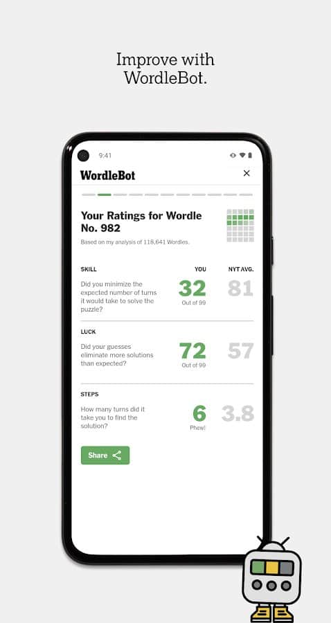 - WORDLE - Josh Wardle'ın yarattığı klasik oyun. 5 harfli kelimeyi 6 tahminde veya daha azında tahmin edin. Stratejilerinizi WordleBot'a karşı test edin, yapay zeka asistanımız.