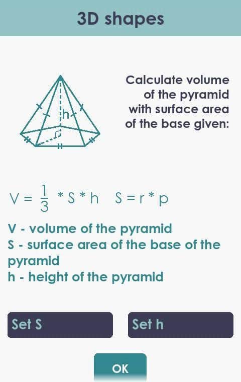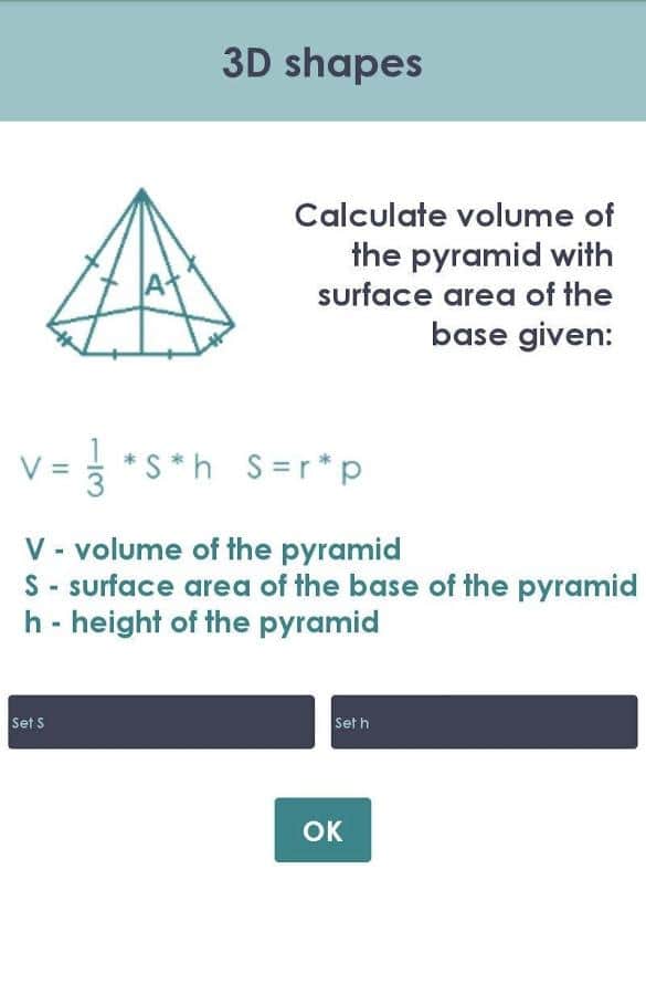 Hacim ve Alan - çeşitli geometrik şekillerin hacim ve alanını 45 farklı yöntemle hesaplamak için harika, kullanışlı ve basit bir program. Program, gerekli girilen verilerin belirtildiği şekil resimlerini, parametrelerin tanımlarını içeren formülleri ve tam çözüm sürecini görüntüler.