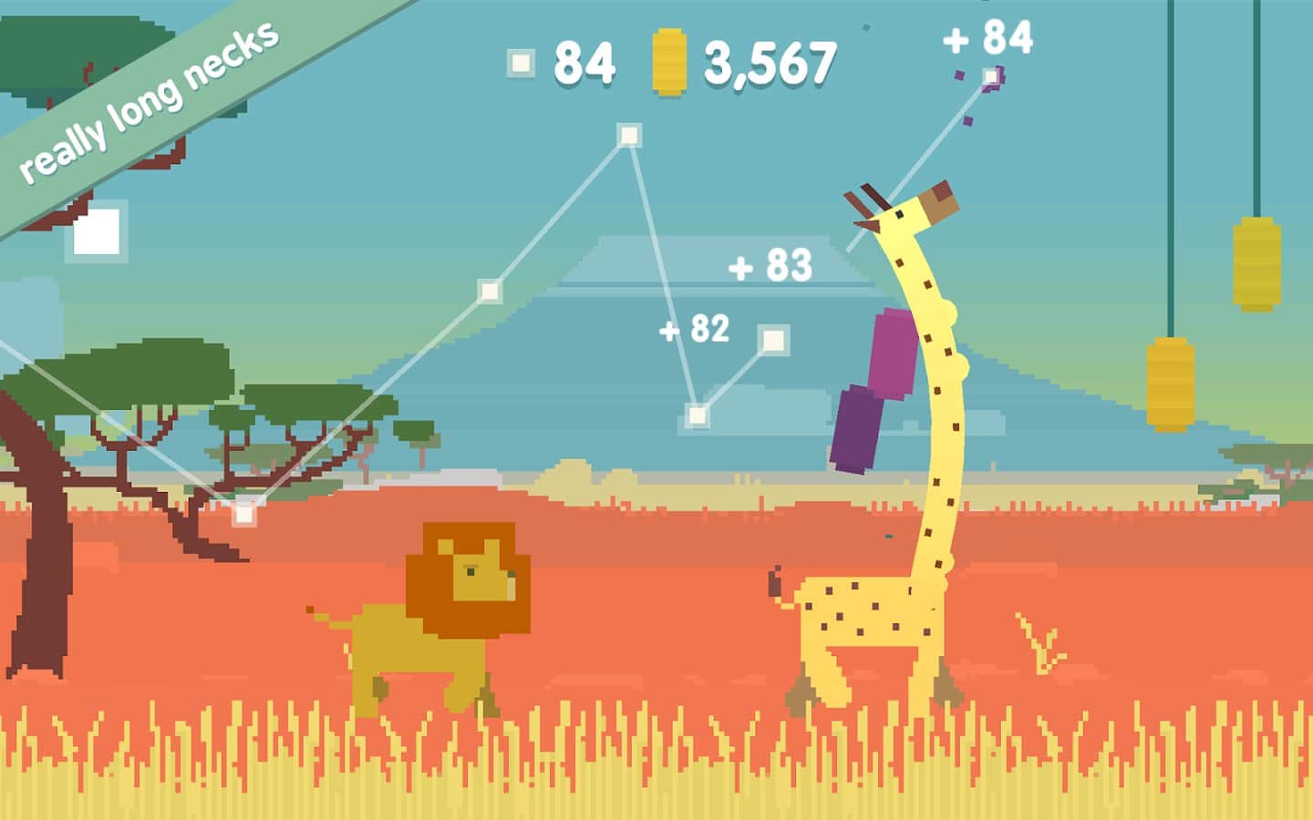 ah benim zürafam - zürafayı kontrol etmeniz gereken eğlenceli bir oyun, arkasında bir aslan sürüsüyle. Zürafayı, aslında meyvelerin asılı olduğu yüksekliklere bağlı olarak boyunu değiştiren boynunu yöneterek yönetin. Oynayın ve heyecan verici süreçten keyif alın, ama dikkatli olun, acımasız aslanların öğle yemeği olmaktan kaçının, çünkü sizi yemek için fırsat kollarlar. Gece saatlerinde oynayın, aslanlar geceleri uyur ve gündüzden daha fazla meyve toplayabilirsiniz.