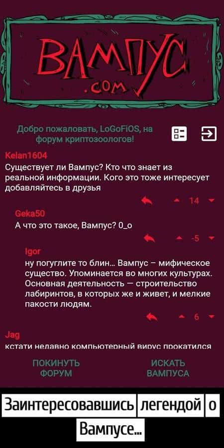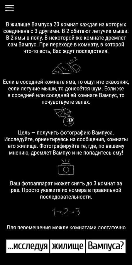 Vampusu Avı – Android için bir metin bulmacası, birçok bulmaca ve zeka oyunu ile. Bu oyundaki ana amacınız Vampusun labirent evine girmek ve onun fotoğrafını çekmektir. Kriptozoologlar arasında Karda Adam, ateş püsküren ejderha, Loch Ness canavarı ve tabii ki Vampus hakkında birçok efsane dolaşıyor. Kriptozooloji forumunun bir üyesi, Vampusun evini bulup içine girmeye ve onun fotoğrafını her ne olursa olsun elde etmeye karar verdi. 20 odadan oluşan labirentlerde hareket edin ve tuzağa düşmemeye çalışın. Vampusun evinde sizi rastgele odalara taşıyan fareler yaşıyor, ayrıca çukurlardan da sakının. Tüm bulmacaları çözün ve en az bir fotoğraf elde etmeye çalışın.