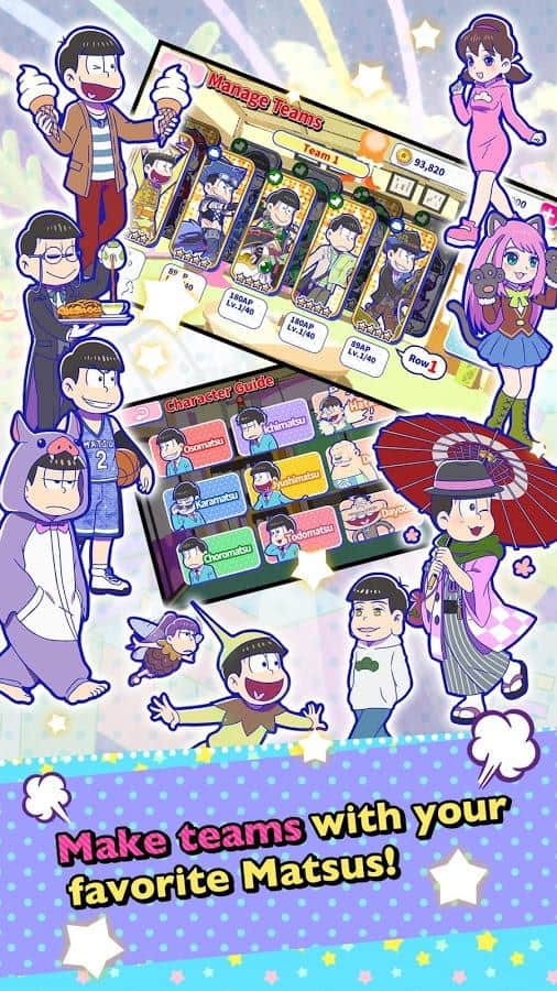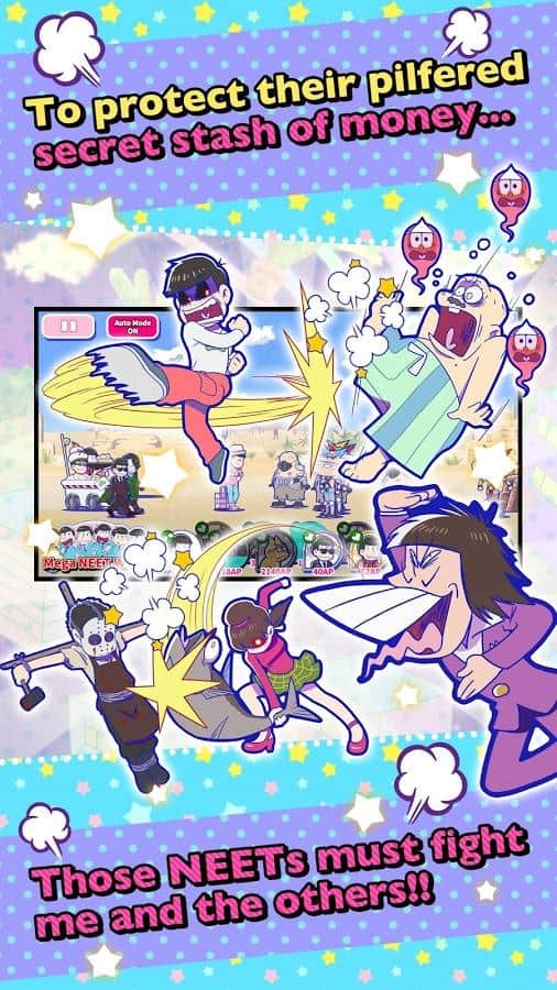 Osomatsu-san Hesokuri Savaşları~NEET'lerin Savaşı – hızlı savaşlarla dolu bir android aksiyon oyunu. Bu anime tarzı oyunda, birçok kahramanı kontrol edebilir ve onlarla düşman şehrine saldırabilirsiniz. Ana amacınız, tüm düşmanları mümkün olan en kısa sürede yenmek ve rakip şehrini yok ederken oldukça fazla para kazanmaktır. Dinamik savaşlara katılın ve rakibin kazanma şansını bırakmamak için benzersiz teknikler ve saldırılar kullanın. İlerlemek için yolunuzu açın ve kahramanlar için çeşitli kostümler ve silahlar satın alın. Oyunun çeşitli mekanlarını keşfedin ve yeni savaşlarda savaşın.