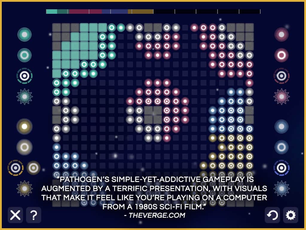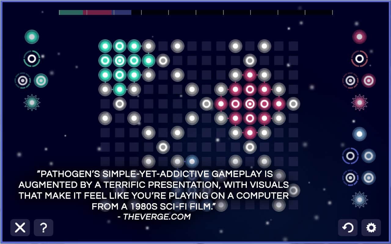 Patogen - Strateji Tahtası Oyunu - android'de oynanabilen, iyi bir grupta oynamanın çok eğlenceli olduğu bir oyun. Oyunun oynanışı, rakibin taşlarını ele geçirip kendi renginize dönüştürmek üzerinedir; kazanacak olan, kendi rengindeki taşları rakibinden daha fazla olan olacaktır. Çok oyunculu modun yanı sıra, bilgisayara karşı oyun becerilerinizi geliştirebileceğiniz tek oyunculu bir oyun da mevcuttur ve çok oyunculu modda oyuncu sayısı 4'e kadar çıkabilir. Harita editörü ile kendi seviyelerinizi oluşturabilir ve bunları arkadaşlarınızla paylaşabilirsiniz.