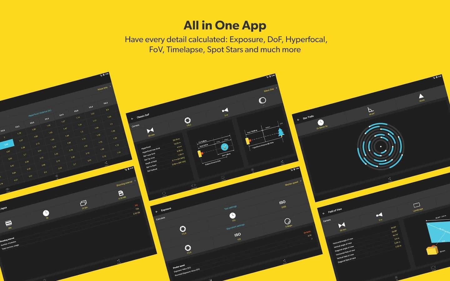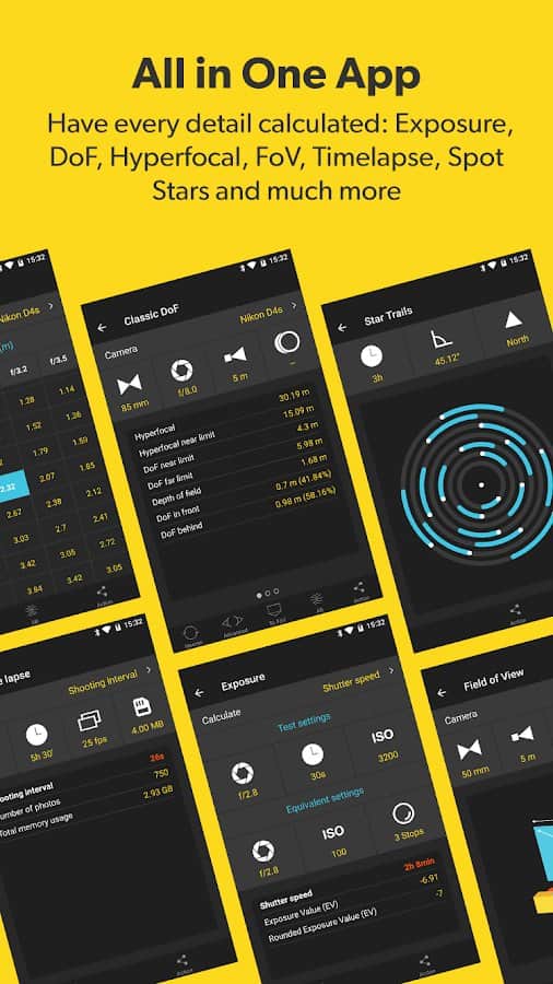 - Birçok türde DOF, FOV, Timelapse vb. hesaplayıcılar.