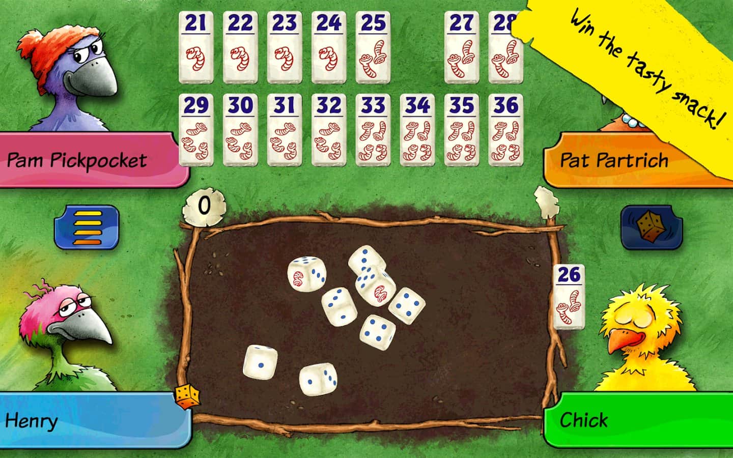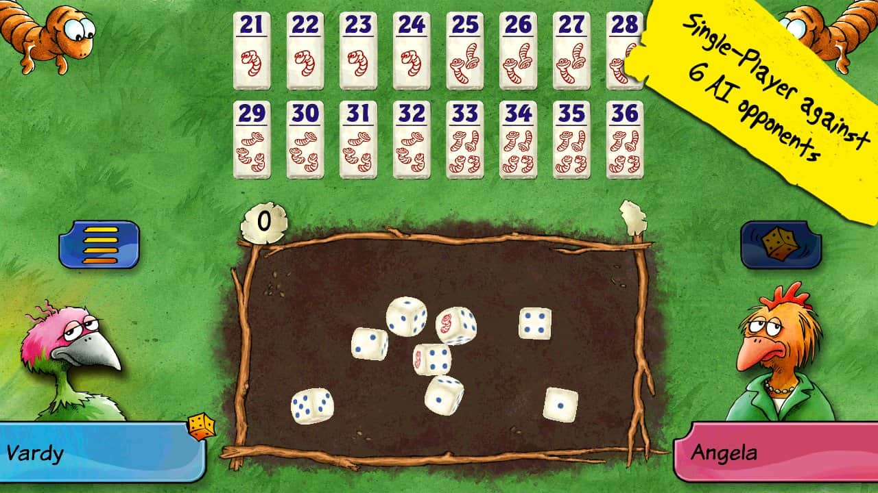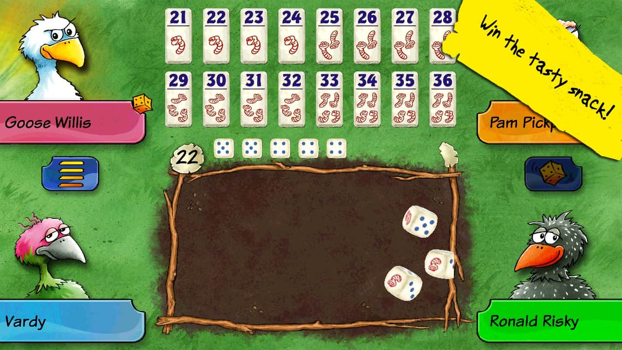 Reiner Knizia'nın Pickomino'su - Izgara üzerinde pişirilmiş solucanlar büyük talep görüyor ve sadece en hızlı tavuk lezzetli atıştırmalıkları kazanabilir. Ama her zaman dikkatli olmalısınız, çünkü en yavaş tavuk ızgaradan bir solucanı kapmakta geç kalırsa sizi de tabaktan alabilir! Arkadaşlarınızla büyük bir grup olarak, birbirinize karşı veya sadece cihazınıza karşı oynayın.