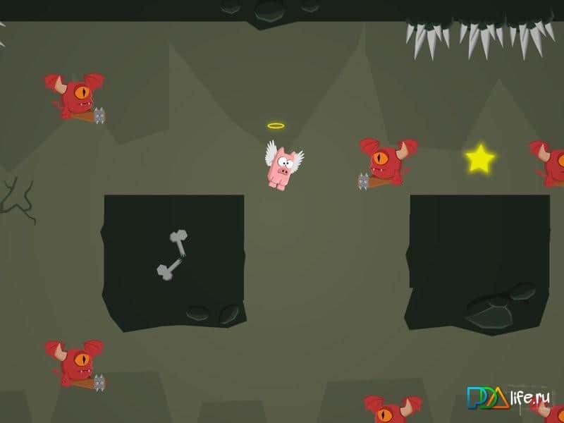 Domuzlar Uçamaz - Android için eğlenceli bir oyun, bize küçük bir domuzun hikayesini anlatacak. Bu neşeli domuz, cehenneme düşmek zorunda kaldı. Ama o kötü bir şey yapmadığı için, bir melek oldu ve şimdi cehennemden kaçması gerekiyor. Ve tabii ki, ona bu konuda yardım edeceksiniz! Seviyelerde uçun, tuzaklardan ve kötü şeytani canavarlardan kaçının. Oyunda toplam seksen ilginç seviye var.