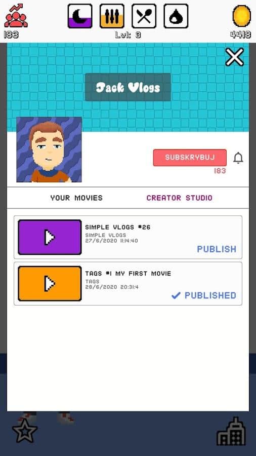 Pikselli Boru Tüccarı – karakterinizi oluşturun, görünümünü ve kıyafetini seçin, ayrıca Pixel Tube'da bir kanal oluşturun ve yavaş yavaş popüler hale gelin. Kahramanla birlikte videolar çekin, yayınlayın ve düzenleyin. Kariyerinizi geliştirin ve bununla para kazanın. İhtiyaçları karşılayın ve şehre çıkın, çeşitli mekanları keşfedin. İnsanlar sizi sokakta tanıyacak, şöhretin tadını çıkarın ve içerik oluştururken onların taleplerine göre yönelin. Düzenli olarak çevrimiçi olmayı ve güncellemeler yapmayı unutmayın, aksi takdirde halk sizi hızla unutacaktır.