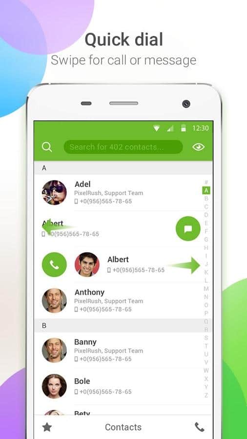 PixelPhone - Bu uygulama, kişi listenizi tamamen değiştirecek. Kullanımı çok kolay ve birçok özelliğe sahip. Örneğin, bir kişiyi sola veya sağa çektiğinizde, akıllı telefonunuz o kişiyi aramaya başlayacak veya bir SMS yazma penceresini açacaktır. Ayrıca, menünün ve tüm kişilerin görünümünü değiştirebilir veya onları widget haline getirebilirsiniz. Ayrıca, numaraları ve kişilerin isimlerini asla karıştırmamak için onları gruplara ayırabilirsiniz.