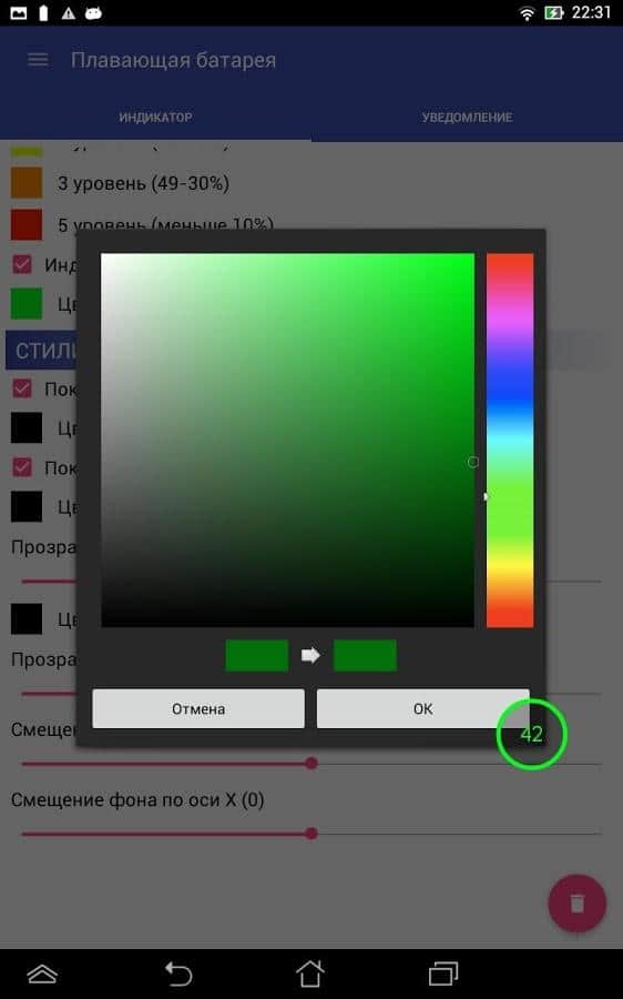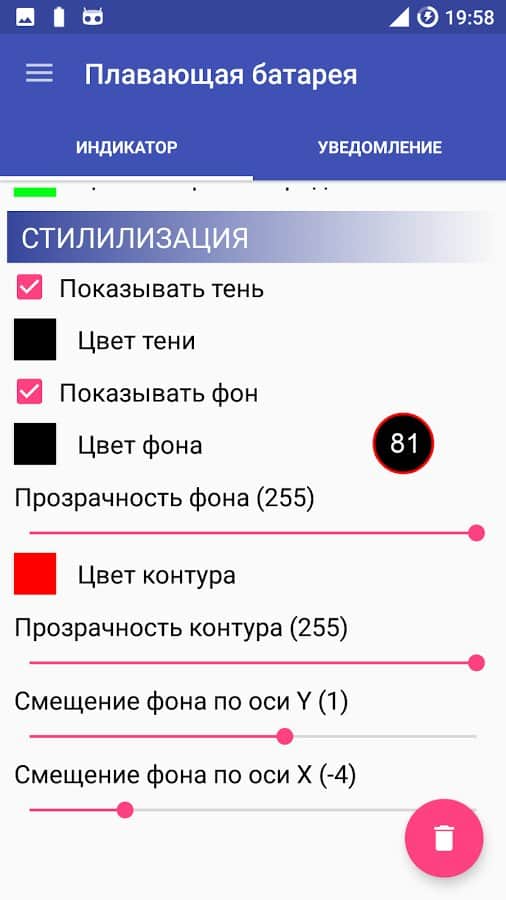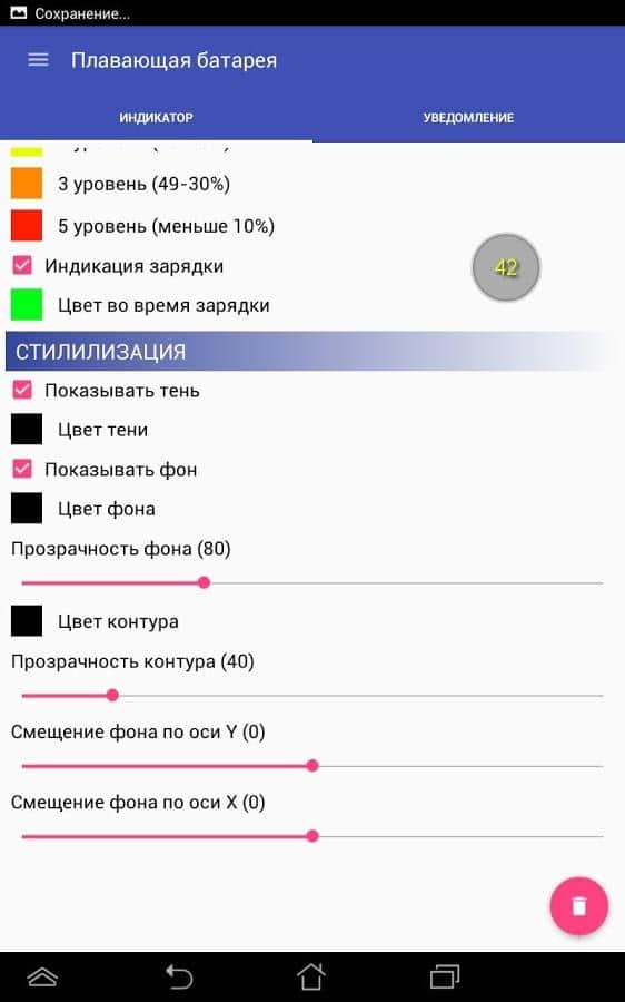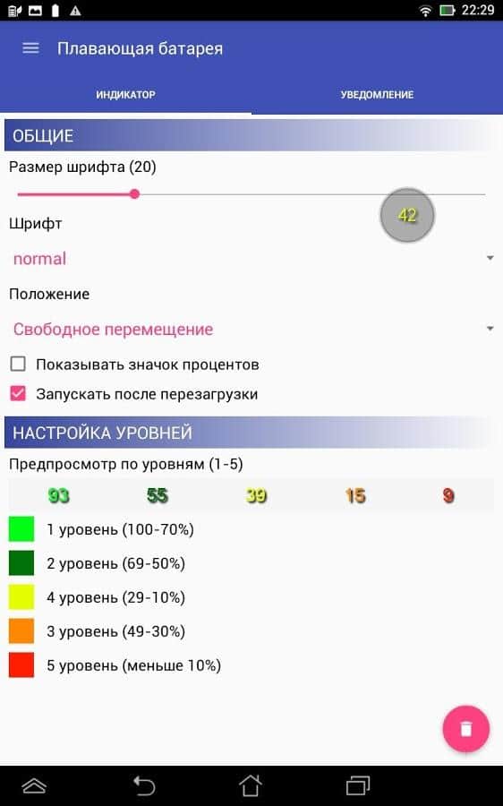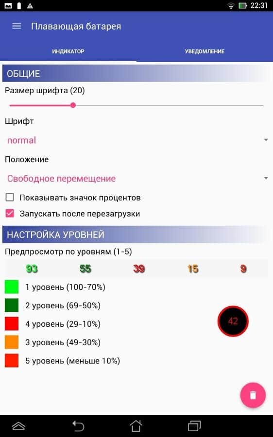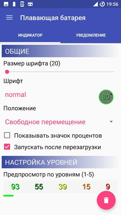 Açık uygulamaların üzerinde görüntülenebilen bir şarj seviyesi widget'ı oluşturur. Kullanıcı, ekran üzerinde istediği gibi hareket ettirebilir ve ayrıca ayarlarda yazı tipini değiştirebilir, boyutunu ayarlayabilir ve şarj gösterimini etkinleştirebilir. Şarj seviyesine bağlı olarak yazı renginin de değişecektir.