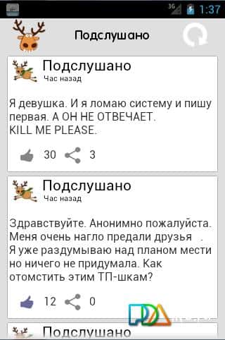 Sasha Di tarafından geliştirilen Android için 'Dinlenildi'. Eğer kendi işinize karışmayı, başkalarının sırlarını ve gizli itiraflarını okumayı seviyorsanız, bu uygulama tam sizlik. 'Dinlenildi', VKontakte'deki kamu sayfası için özel olarak oluşturulmuştur, okuyun ve inanılmaz, komik ve sıradışı hikayelerin tadını çıkarın!