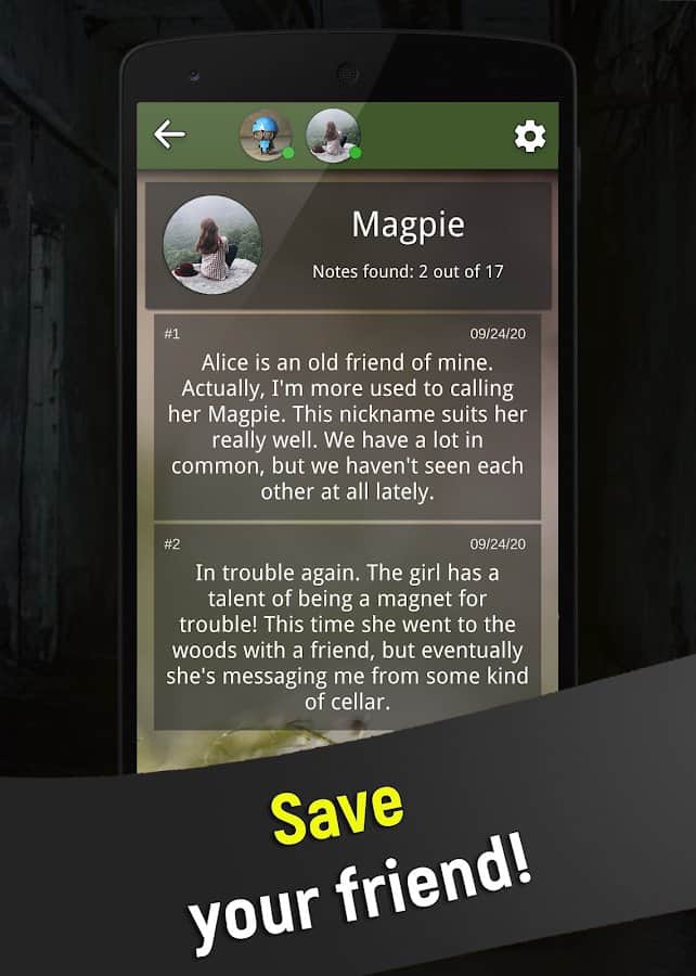 Malikane 2. Metin macerası - Sizi içine çeken suçların cevaplarını bulun, arkadaşlarınızdan biri iletişimsiz kaldı ve bilinmeyen bir yöne kayboldu. Her şey yakın zamanda ve çok hızlı bir şekilde gerçekleştiği için, kaçıranların kesinlikle çok yakınlarda olduğunu ve arkadaşınızın vahşi doğada tutulduğunu biliyorsunuz. Onun hayatı, karşınıza çıkan bulmacalar şeklindeki tuzakları nasıl çözeceğinize veya yaklaşan bir tehlike durumunda nasıl hareket edeceğinize tamamen bağlı. Oyun sırasında sadece çeşitli başarılar elde etmekle kalmayacak, aynı zamanda değişen sonlarla da karşılaşacaksınız.