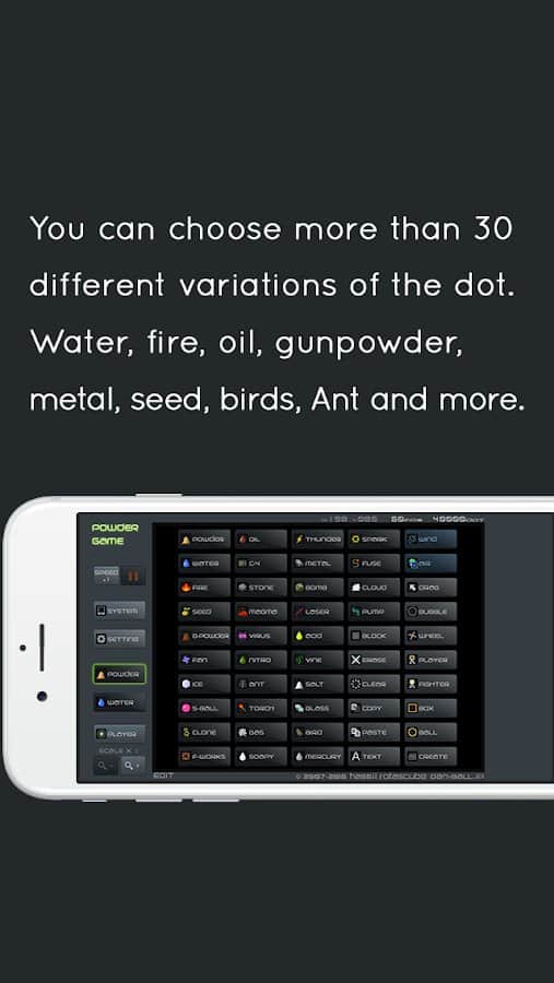 Toz Oyunu - Doğanın kendisi tarafından yaratılan gerçekçi süreçler, belirli nesnelerin etkileşimlerinin fiziksel sonuçlarıyla gerçekten etkileyicidir. Koleksiyonunuzda bir araya getirilecek en temel kaynaklar veya fiziksel olgular, bir araya getirip sonuçlarını görebileceğiniz: ateş, su, barut, kuşlar, karıncalar, rüzgar, yağ, metal, tohumlar, gök gürültüsü, toz, buz, tuz, cıva, sabun, havai fişekler ve daha fazlası. Aynı sonucu yeniden elde etmek için belirli verileri oluşturabilir, kopyalayabilir, temizleyebilir veya yapıştırabilirsiniz.