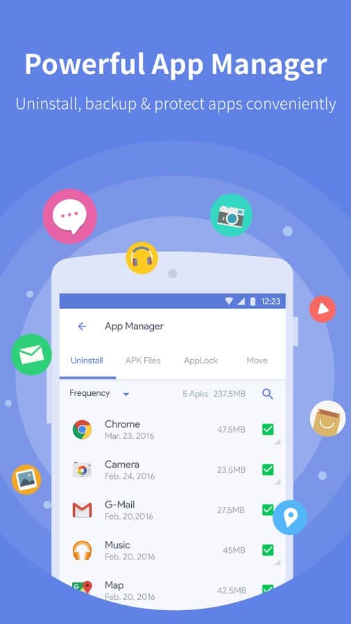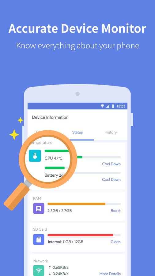 Bu küçük uygulama, basit ve anlaşılır bir arayüze sahip olup, akıllı telefonunuzu temizlemek ve hızlandırmak için gerekli tüm araçları bir araya getiriyor. Tüm parametrelerde daha hızlı yön bulmanıza yardımcı olacak görsel grafikler şeklinde sunulmuştur. Önbellek veya daha önce silinmiş uygulamaların kalıntıları gibi "gereksiz" dosyaları silebilir, hafızayı optimize edebilir ve cihazın ana parametreleri hakkında detaylı bilgi alabilirsiniz (işlemci ve RAM kullanımı, pil durumu ve kapasitesi, sıcaklık durumu vb.).
