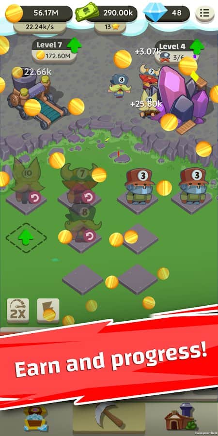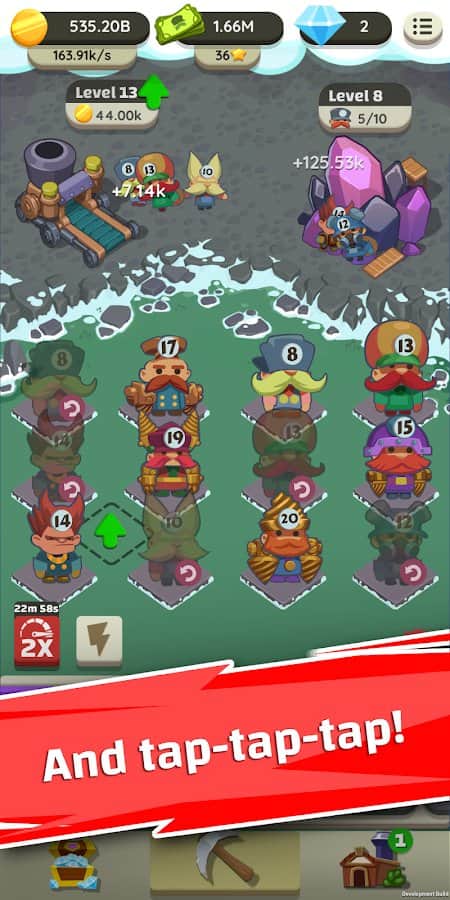 Güç Madencileri: Birleştir ve İnşa Et Tembel Tycoon – Android için ilginç bir oyun, burada aynı madencileri birleştireceksiniz. Bu oyunda, altın madenciliğinin hakim olduğu bir karikatür dünyasında bulunacaksınız ve herkes altın ve değerli taşlar çıkarmak için yola çıkmıştır. Aynı madencileri birleştirerek yeni madenciler elde edin. Altın çıkarın, ihtiyaç duyduğunuz malzemeleri satın alın, evler ve atölyeler inşa edin. Madenci koleksiyonunuzu genişletin ve yeni türler açın. Yeni alanları keşfedin ve mümkün olduğunca çok altın çıkarmaya çalışın.