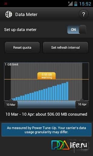 - Veri Ölçer işlevi, sınırlı bir tarifeye sahip kullanıcılar için vazgeçilmezdir. Eğer her ay belirli bir miktar 3G veriyi indirimli fiyatla alıyorsanız ve aşım durumunda neredeyse bütün maaşınız alınıyorsa, programda aylık indirilen veri limiti belirleyebilir ve uygulama sizi aşım konusunda önceden uyarır.