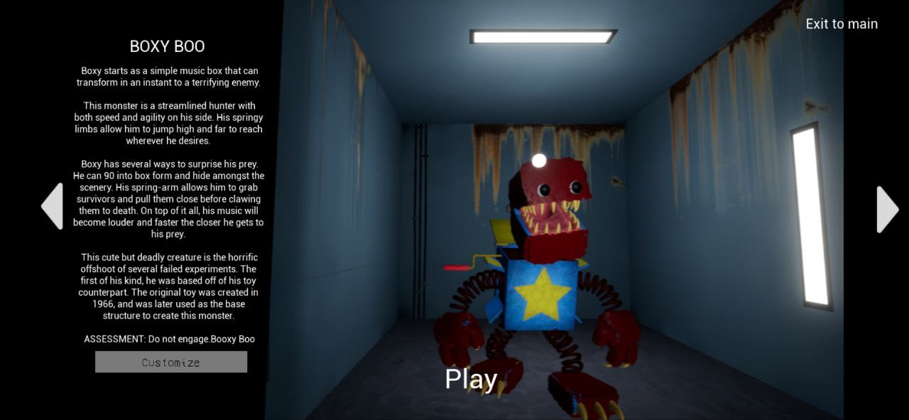 PROJECT: PLAYTIME — altı oyuncunun terkedilmiş bir fabrikada dev bir oyuncağı toplamaya çalıştığı gerilim dolu çok oyunculu bir korku oyunudur; yedinci oyuncu ise korkunç bir canavar olarak onların peşindedir. Hayatta kalan olarak bulmacaları çözecek, parçaları arayacak ve eşyaları hareket ettirmek, mekanizmaları aktive etmek ve avcının önünde kapıları kapatmak için uzatılabilir kolları olan bir tutma paketi kullanacaksınız. Eğer canavar tarafını seçerseniz, Huggie Wuggie, Mommy Long Legs veya Boxy Boo'dan biri olarak oynama şansınız olacak; her birinin kendine özgü tarzı ve özel yetenekleri var. Canavarlar ekipmanı yok eder, pusu kurar ve kaos yaratır, böylece hayatta kalanların oyuncağı toplamasını ve kaçmasını engeller.