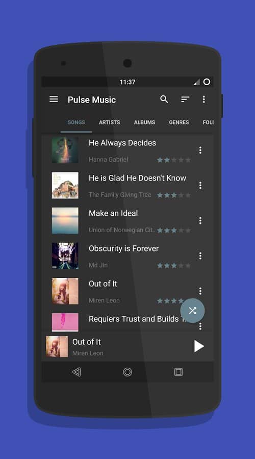 Pulse Müzik Oynatıcı - Çok basit ama çok kaliteli bir müzik oynatıcıdır. İçinde sanatçı, ses kaydı süresi veya kendi müzik koleksiyonunuz gibi çeşitli kriterlere göre kütüphaneler oluşturma gibi tüm temel işlevleri bulacaksınız. Ayrıca burada basit bir arayüz var, hem de oldukça güzel bir şekilde tasarlanmış, sıradan düğmeler şeklinde yapılmış. Bu uygulama çok sayıda cihazda desteklenmektedir ve neredeyse her ses formatını desteklemektedir.