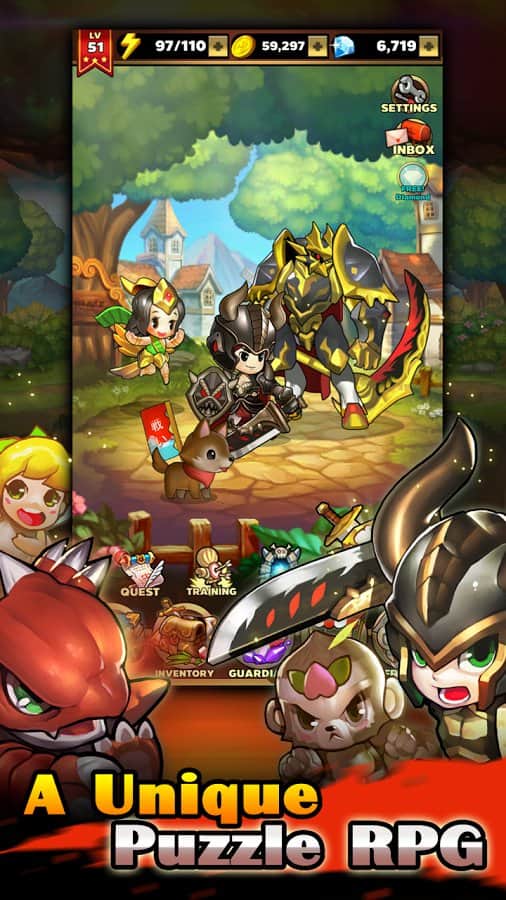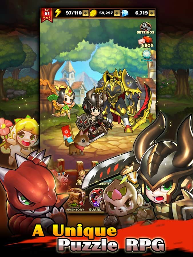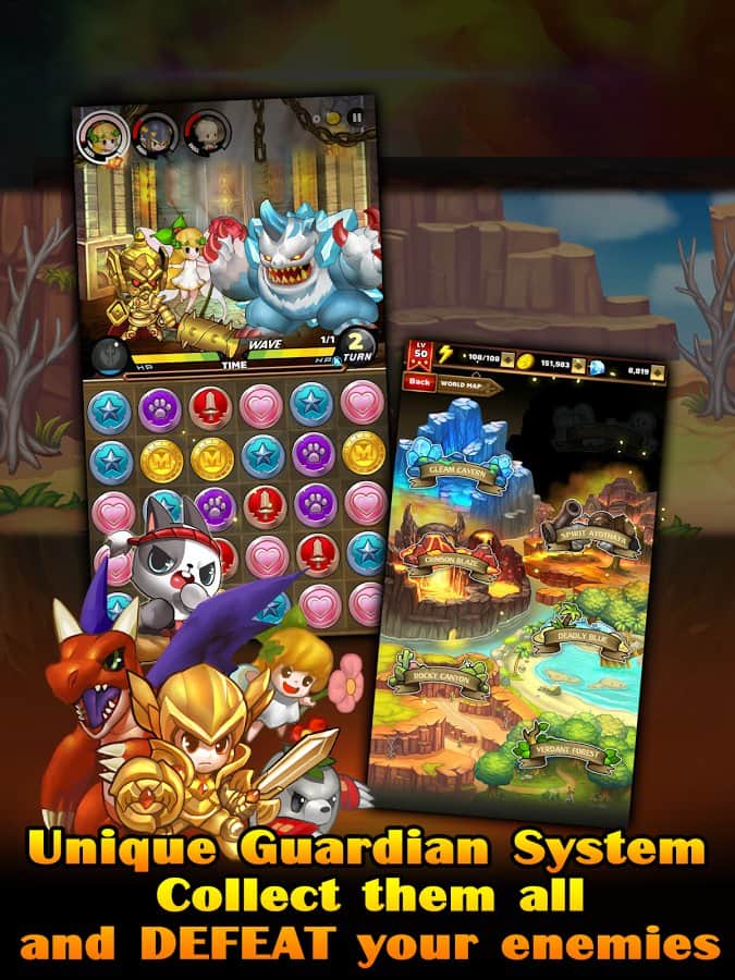 Puzzle Guardians – Android için bir RPG, üçlü eşleme unsurları ile, kahramanlara canavarlara karşı zafer kazanmaları için zihinsel yeteneklerinizi kullanmanız gereken bir oyundur. Oyunun masalsı dünyasında seyahat edin ve üç veya daha fazla aynı nesneyi bir sıraya koyarak sayısız rakibe saldırın. Kaybetmeyecek kombinasyonlar oluşturarak birçok büyü ve silah kullanın. Cesur kahramanlarınızı ileriye taşıyın ve canavarlara hiçbir şans vermeden nesnelerden mümkün olduğunca uzun sıralar oluşturun. Oyun boyunca kahramanlarınızın yeteneklerini güçlendirin ve geliştirin ve ödül olarak birçok ekipman ve silah alın. Heyecan verici savaşlara katılın ve yeni kahramanlar keşfedin.