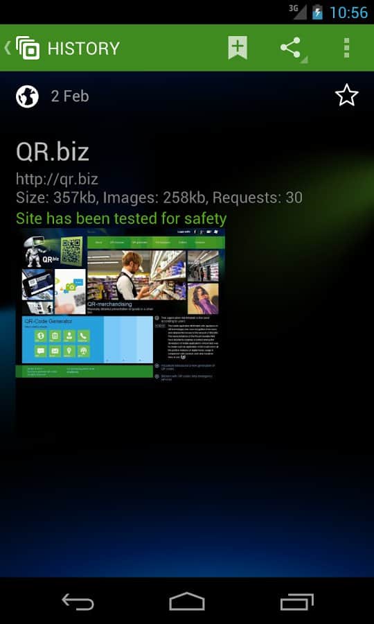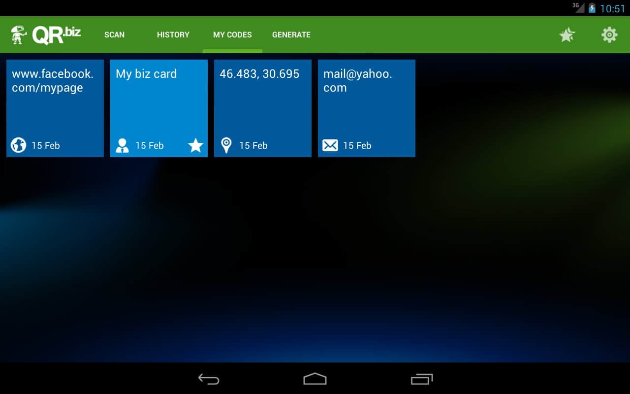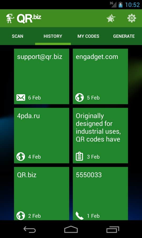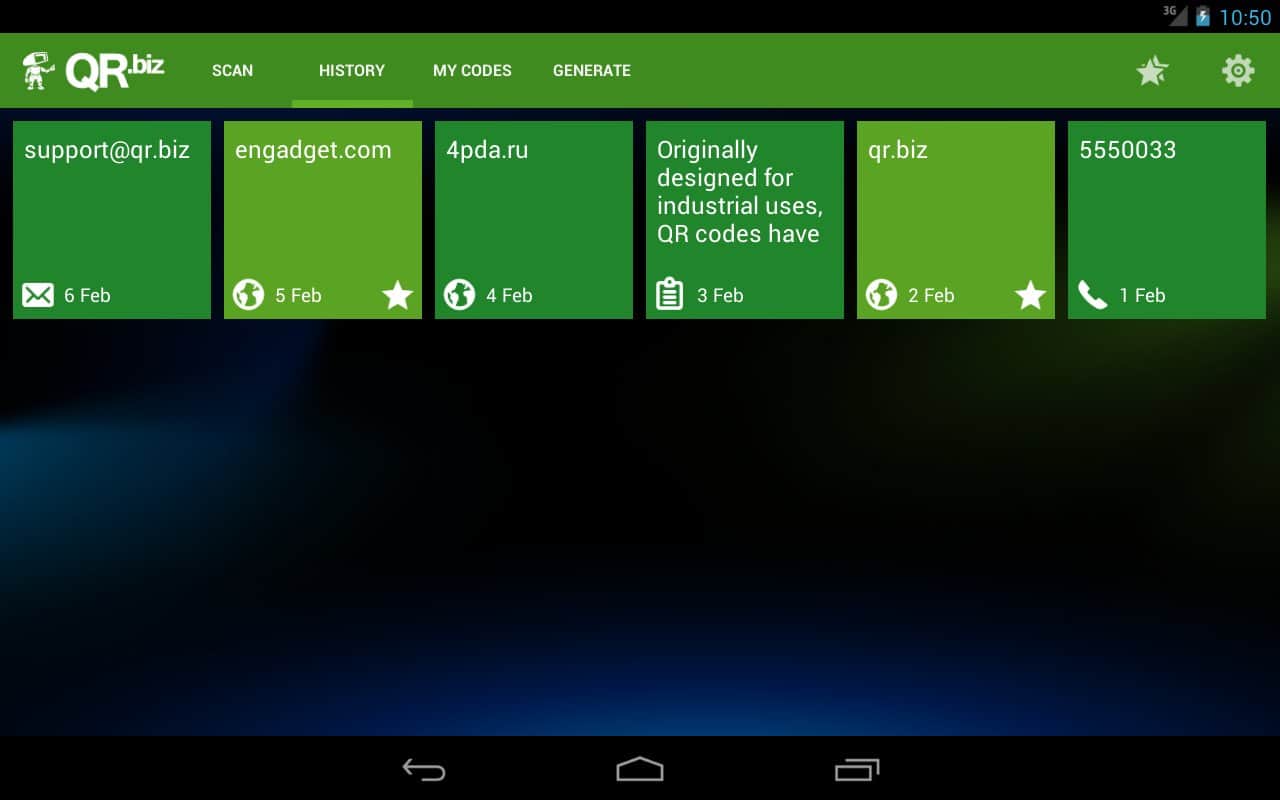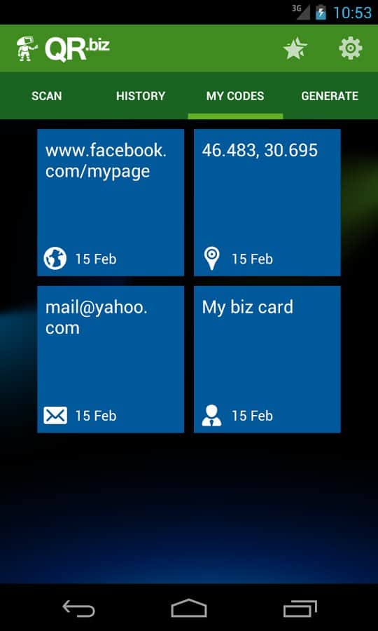 QR.BIZ tarayıcı ve oluşturucu - Android cihazlar için iki bir arada, basit ve kullanışlı bir tarayıcı ve aynı zamanda QR kodları oluşturucu. İstediğiniz türde QR kodları oluşturun: metinler, bağlantılar, coğrafi etiketler, e-postalar, SMS veya kartvizitler. Geçmişe hızlı erişim ve basit yönetim, programla nasıl çalışacağınızı hızlıca anlamanızı sağlayacak. Kullanın!