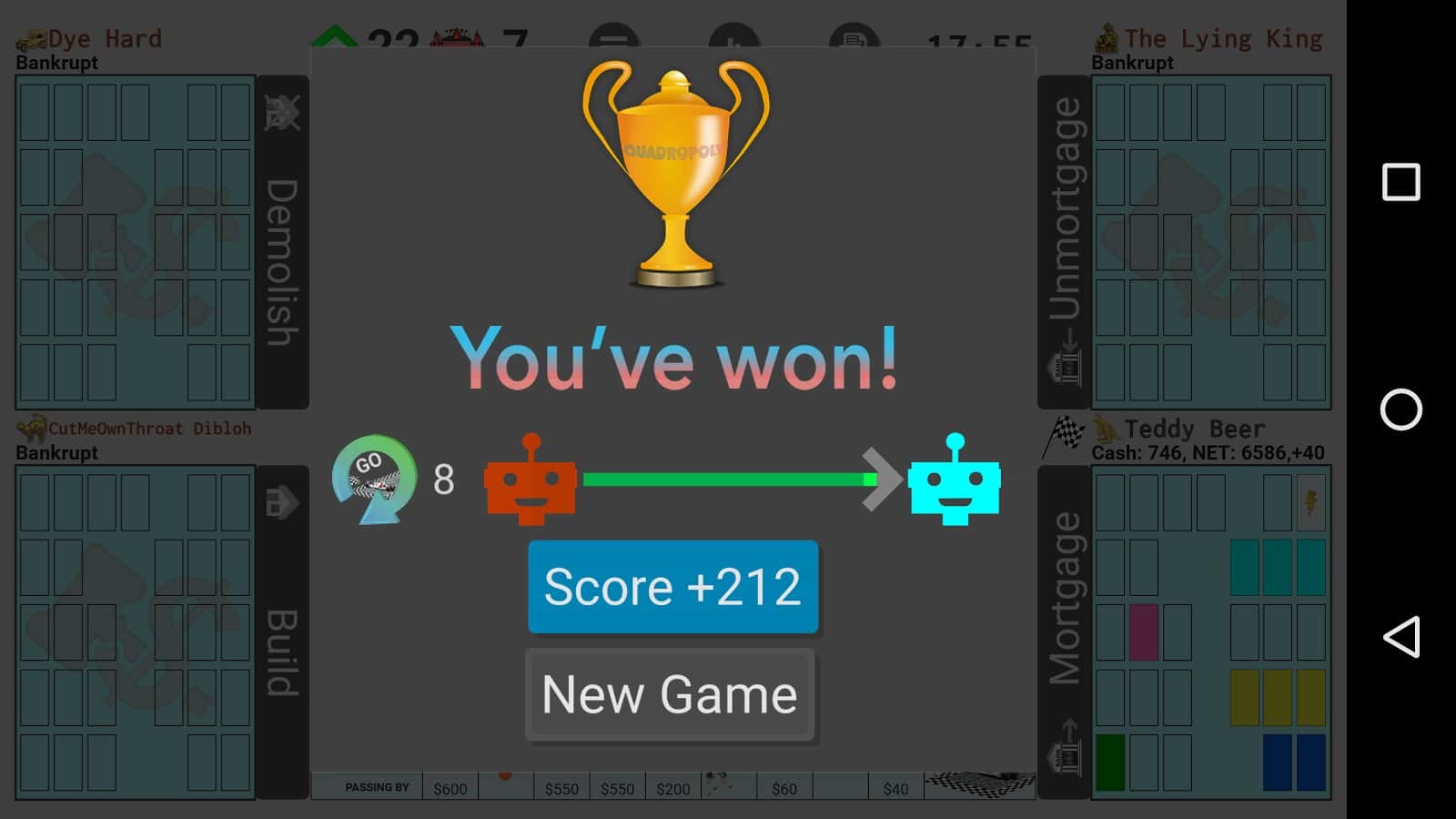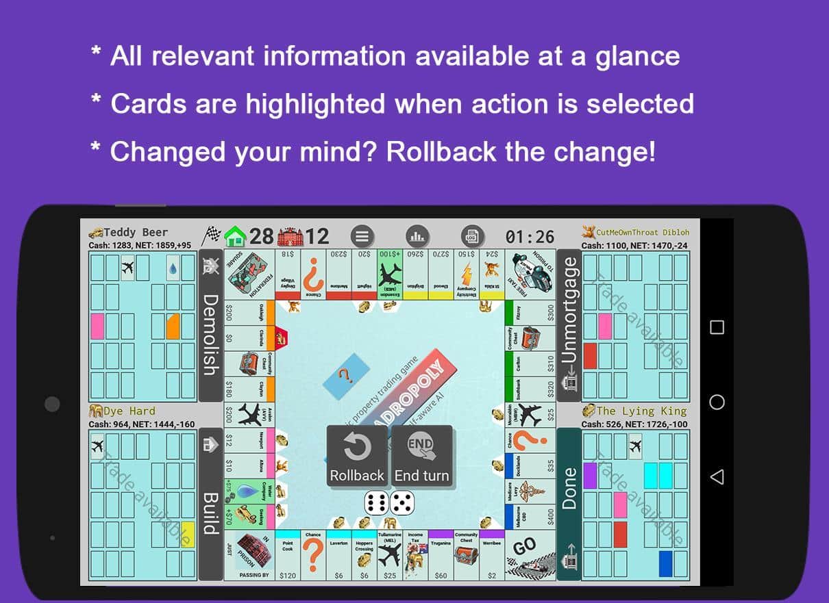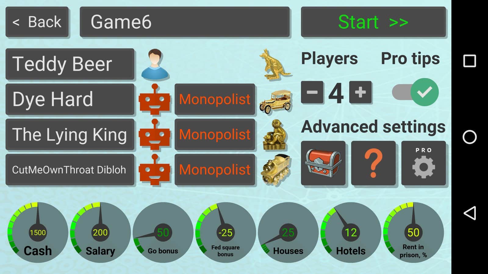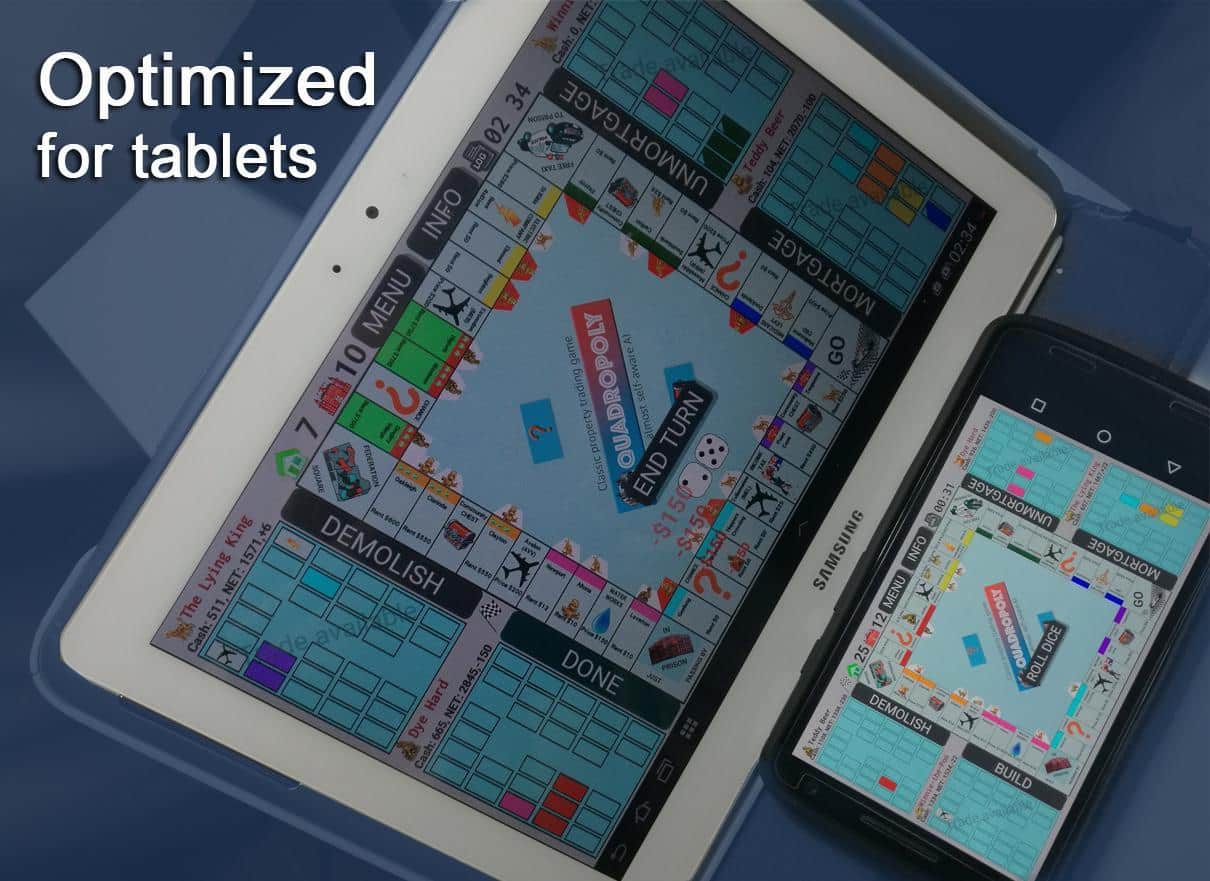 Quadropoly Pro – popüler bir masa oyunu, burada monopoli oynayacaksınız. Bu oyunda amacınız, küçük paralarla gayrimenkul satın almak ve diğer iş insanlarıyla pazarlık yapmaktır. Oyun becerilerinizi geliştirin ve deneyimli AI ile rekabet ederek en iyi oyuncu olun. Oyunda birkaç zorluk modu bulunmaktadır, size uygun olanı seçin ve monopoli oynarken harika sonuçlar elde edin. Ayrıca oyun, gayrimenkul alımında faydalı ipuçlarını dinleyerek eğitim alabileceğiniz geniş bir ayar seti ile sizi memnun edecek. Bu oyundaki her AI'nın, risk ve mülkiyet konusundaki tutumuna göre belirlenen kendi bireyselliği vardır.