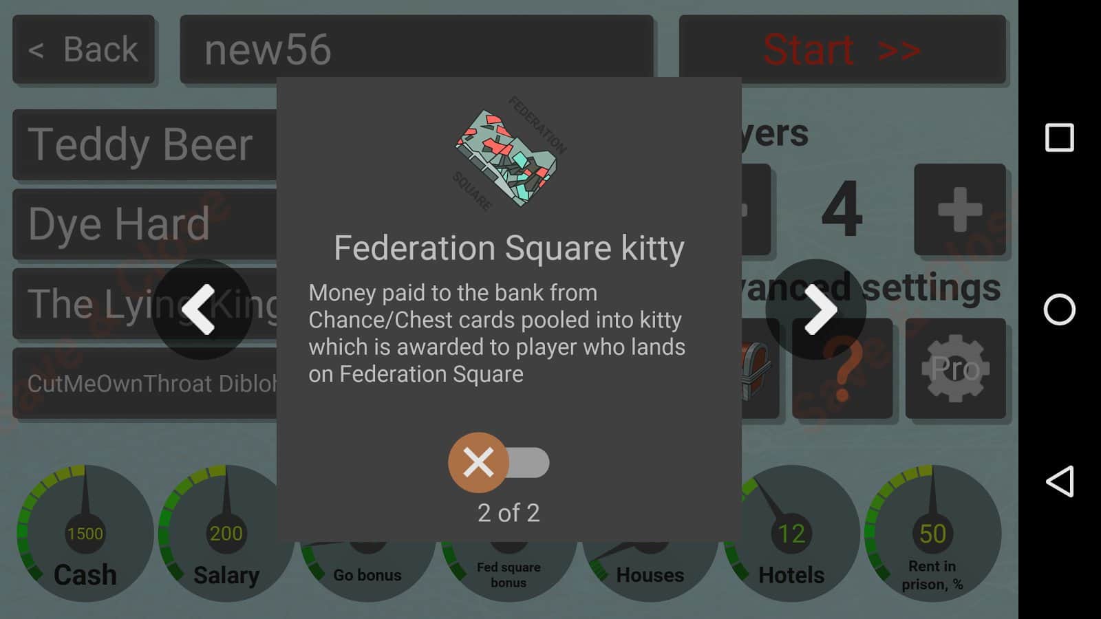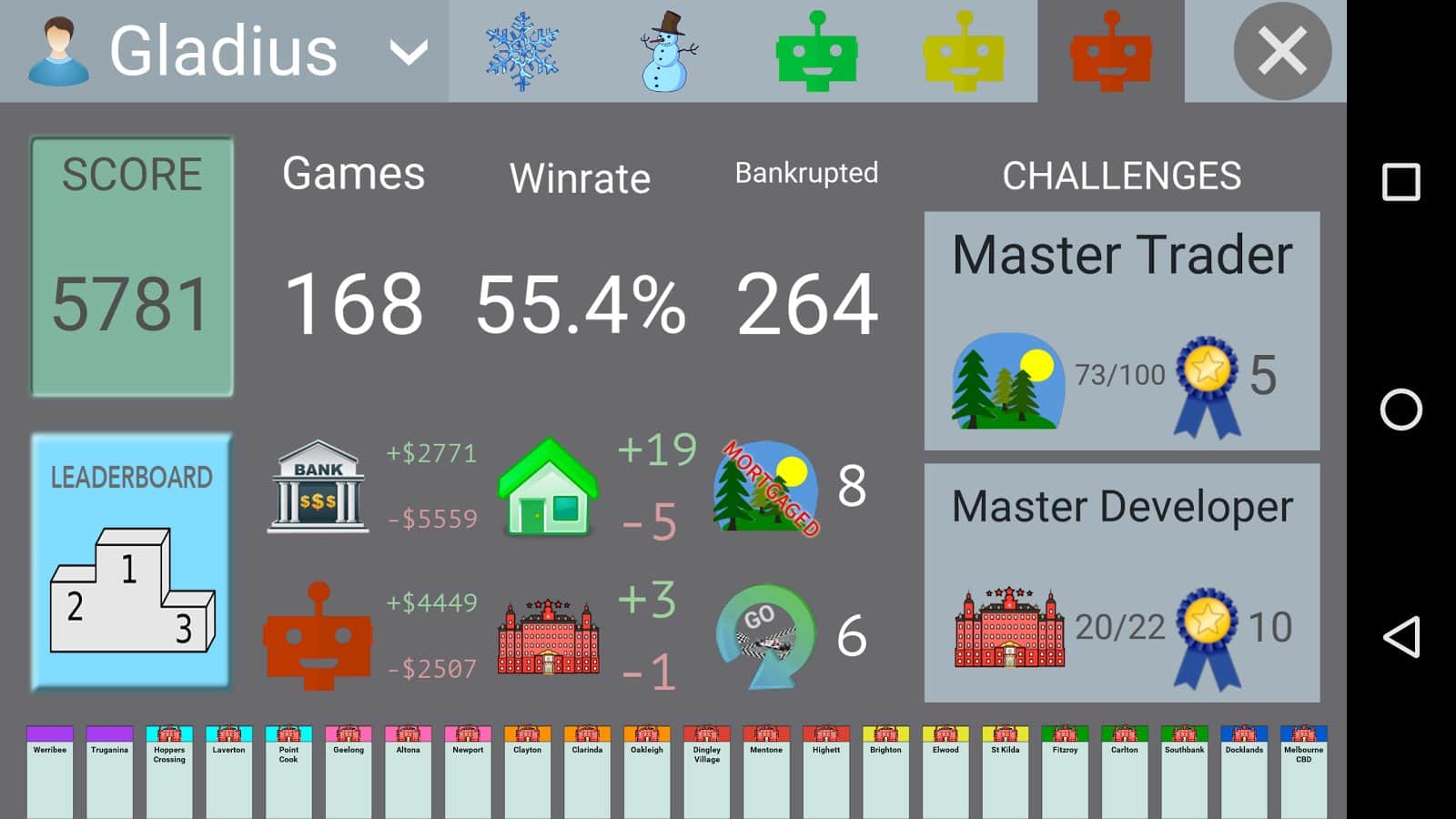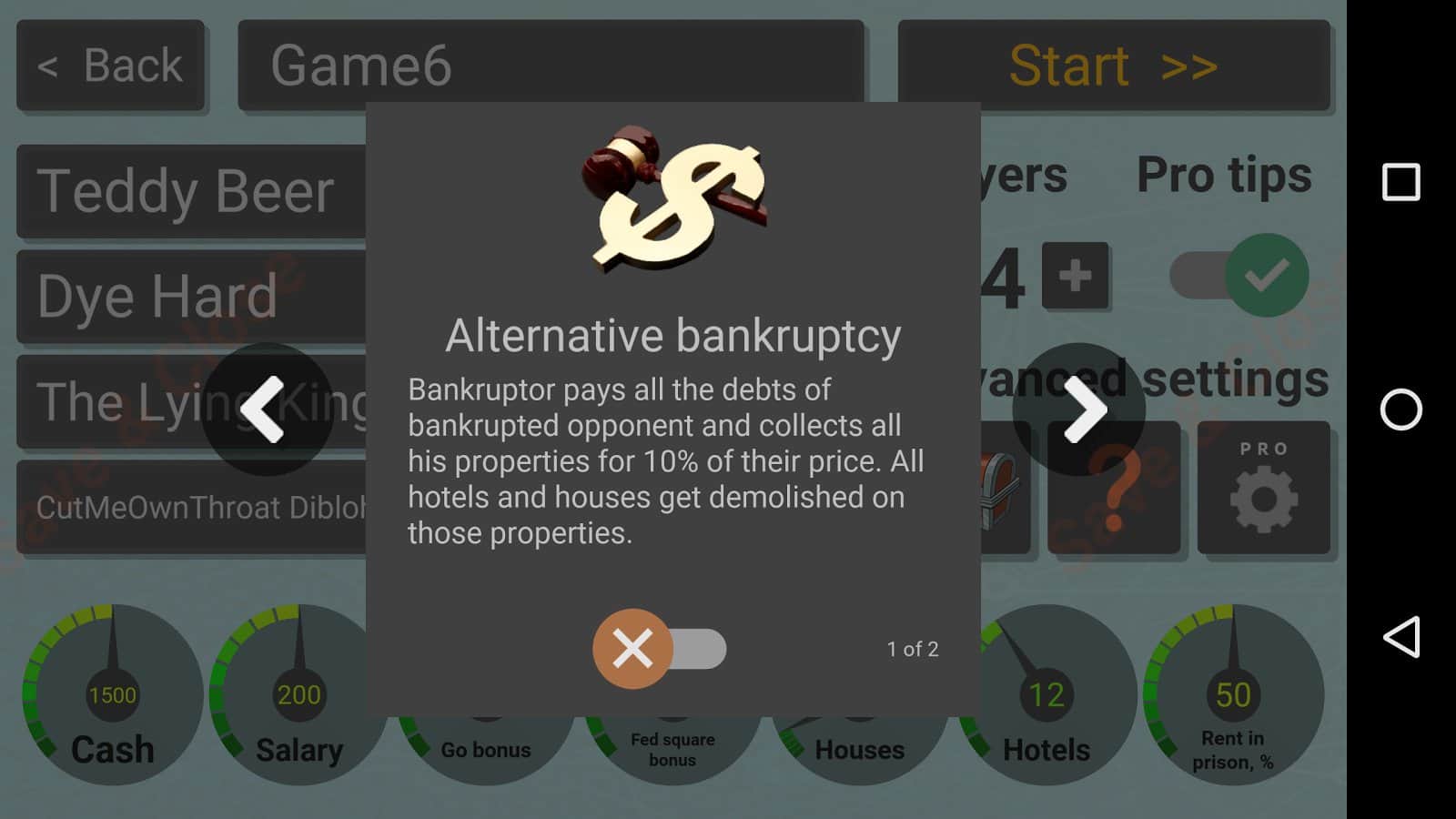 Quadropoly Pro – popüler bir masa oyunu, burada monopoli oynayacaksınız. Bu oyunda amacınız, küçük paralarla gayrimenkul satın almak ve diğer iş insanlarıyla pazarlık yapmaktır. Oyun becerilerinizi geliştirin ve deneyimli AI ile rekabet ederek en iyi oyuncu olun. Oyunda birkaç zorluk modu bulunmaktadır, size uygun olanı seçin ve monopoli oynarken harika sonuçlar elde edin. Ayrıca oyun, gayrimenkul alımında faydalı ipuçlarını dinleyerek eğitim alabileceğiniz geniş bir ayar seti ile sizi memnun edecek. Bu oyundaki her AI'nın, risk ve mülkiyet konusundaki tutumuna göre belirlenen kendi bireyselliği vardır.